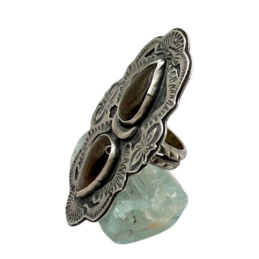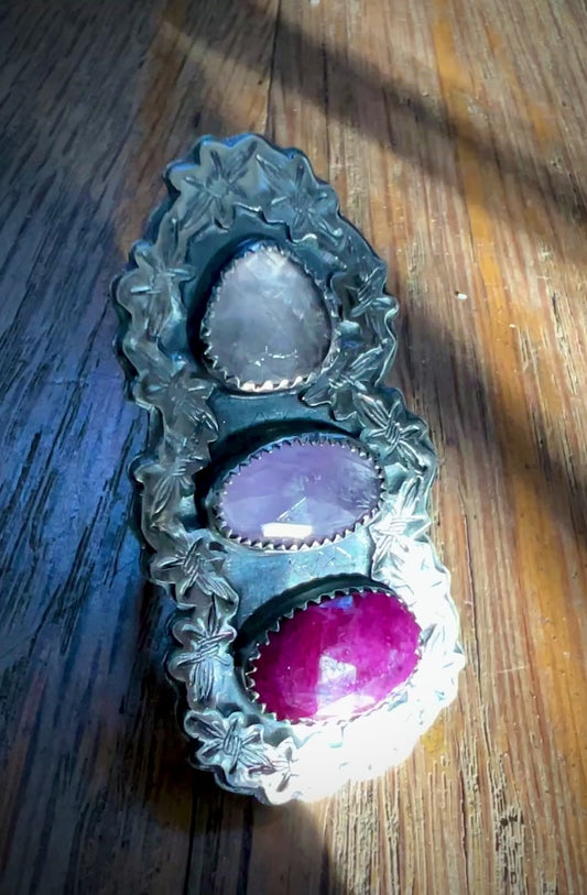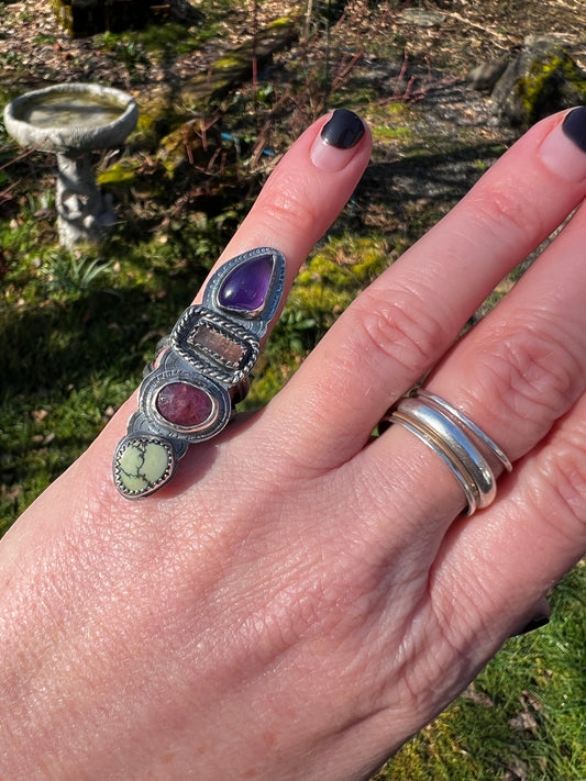 One of a kind, hand sawed, stamped and soldered rings of sterling or brass with all sorts of fun crystals and extra accoutrements.