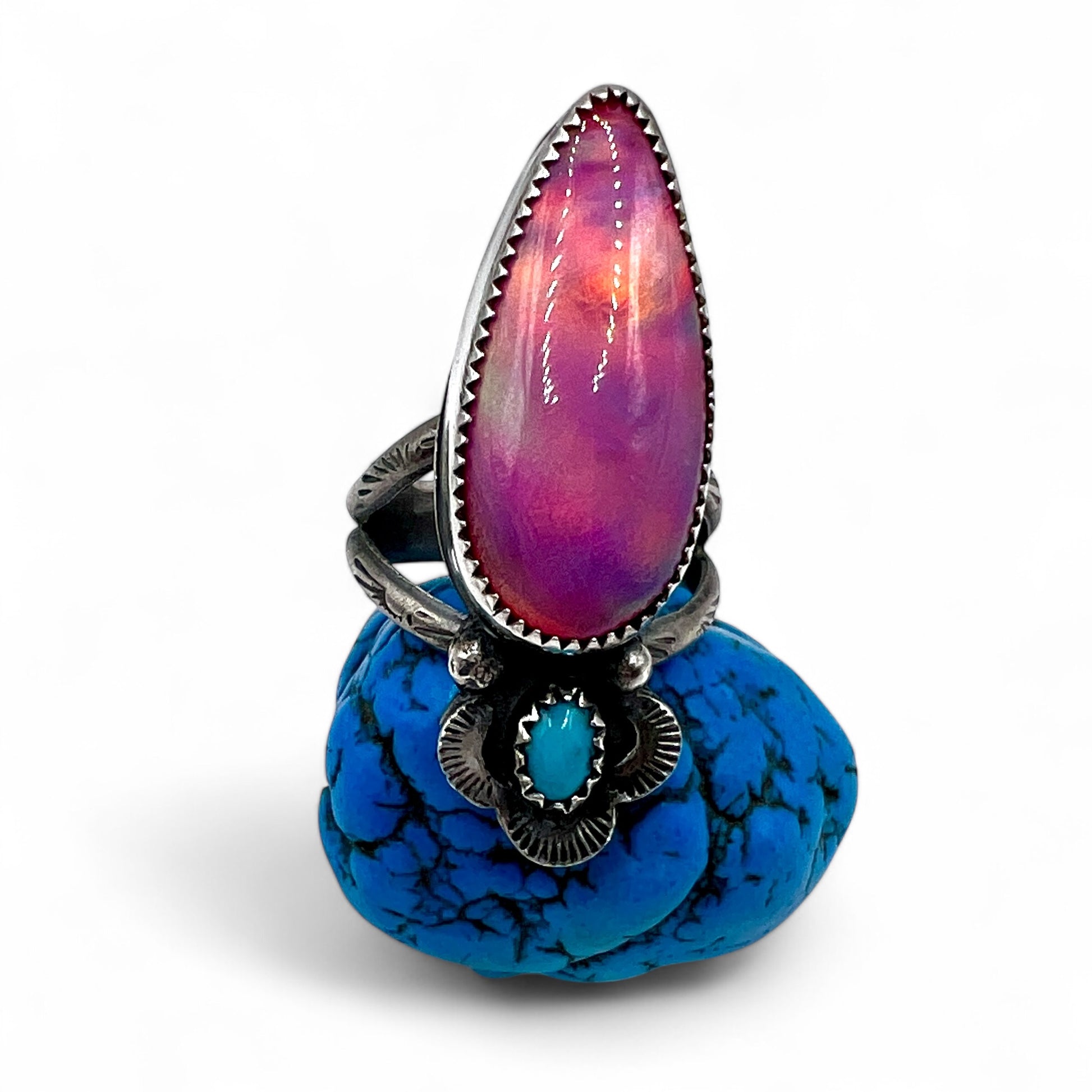 One of a kind, handcrafted sterling silver 2 stone ring of flashy, gorgeous aura Opal & Sleeping Beauty Turquoise. There are pretty flourishes & handmade sterling balls soldered to the top of the ring, surrounding the turquoise stone.