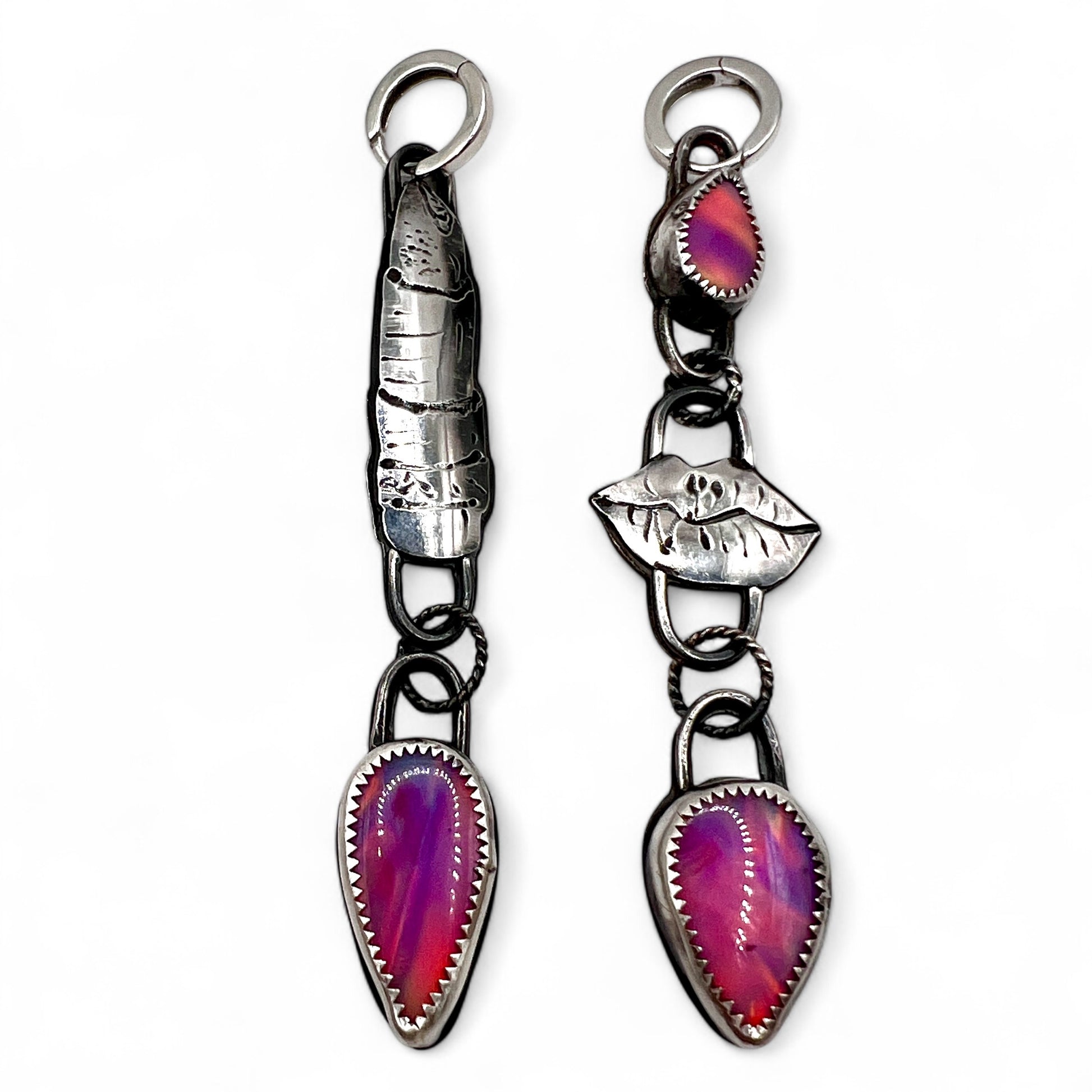 One of a kind, handcrafted, sterling silver earrings that are sisters, not twins! One earring has hand hammered a hand forged tube of open lipstick. You can interpret the color 😉.