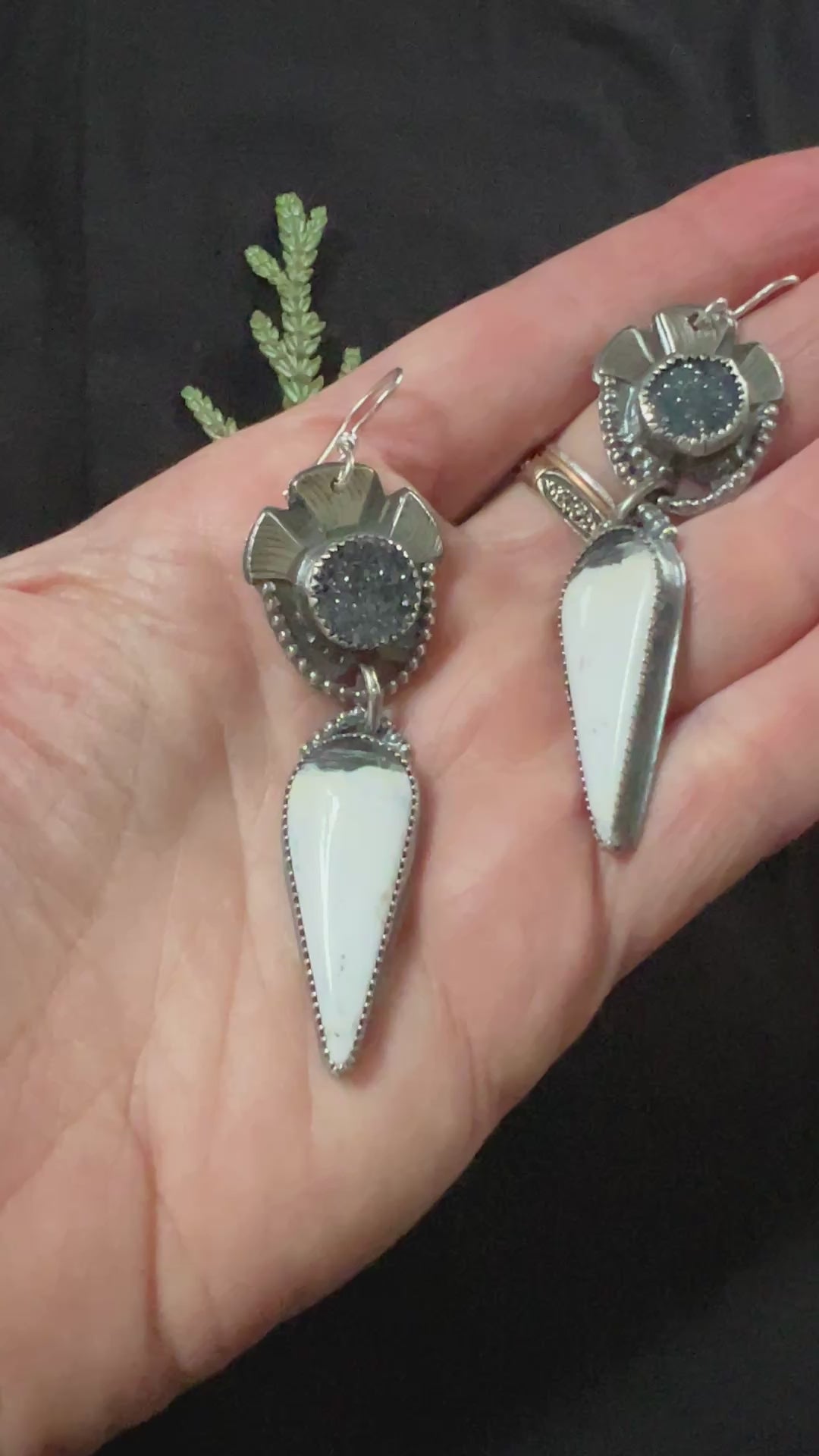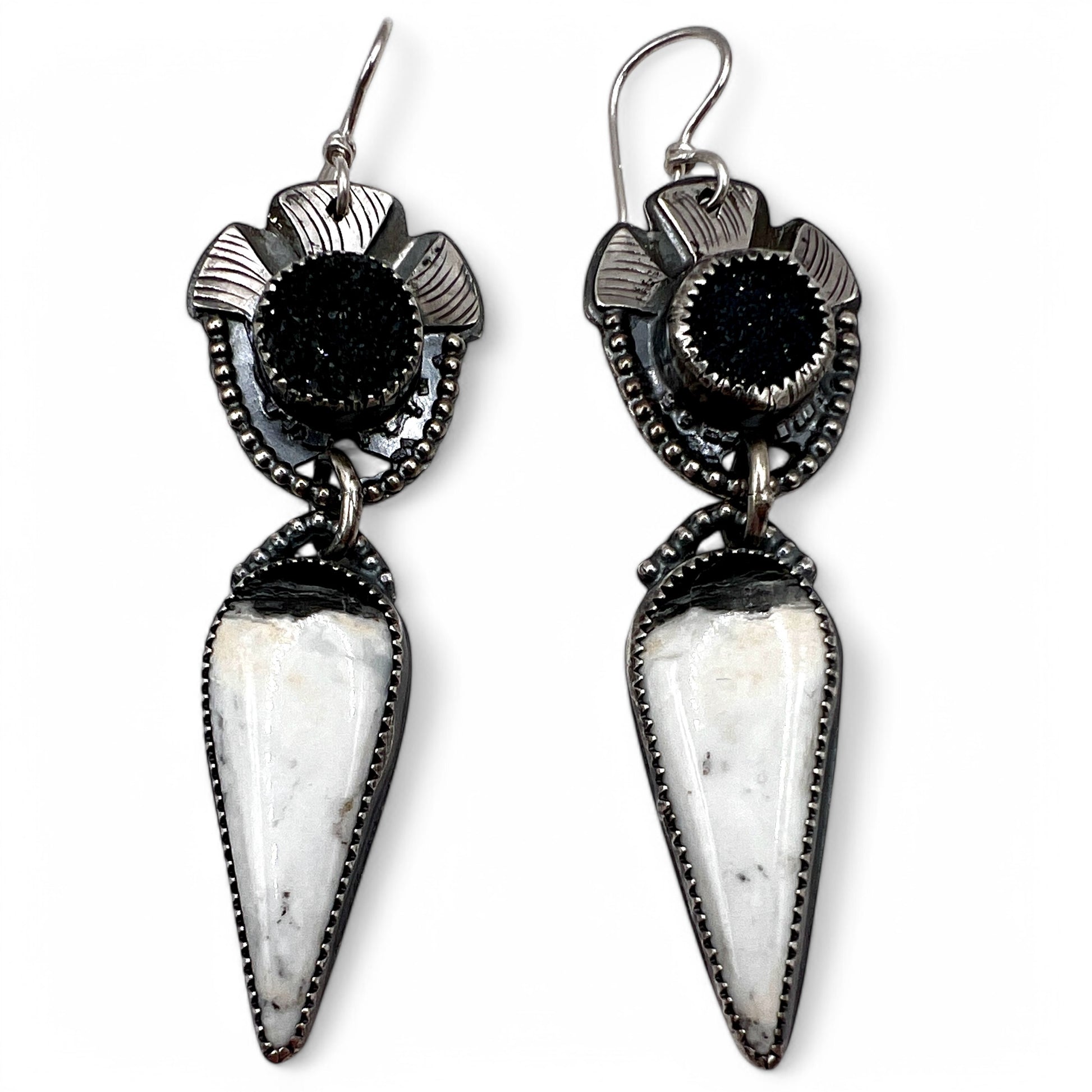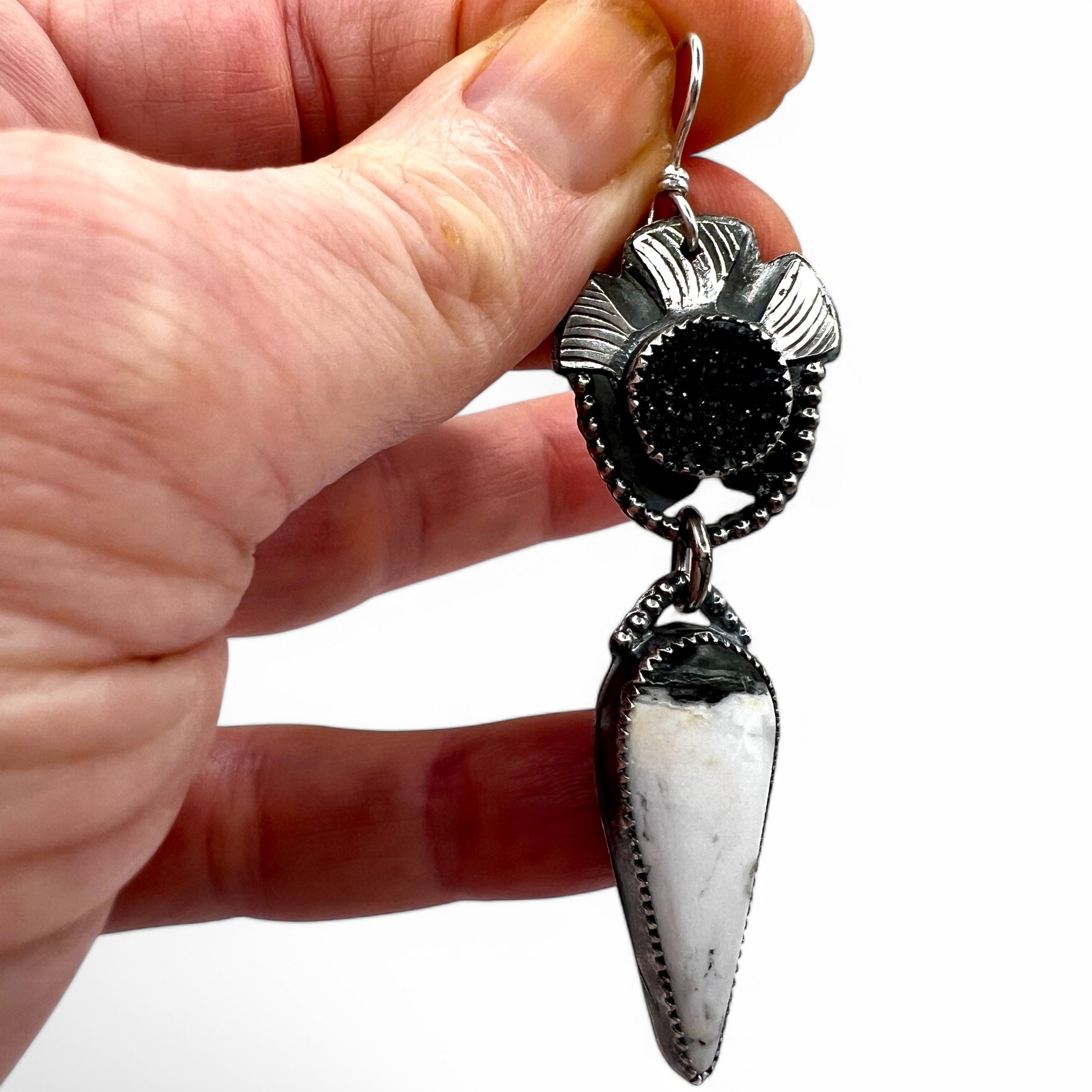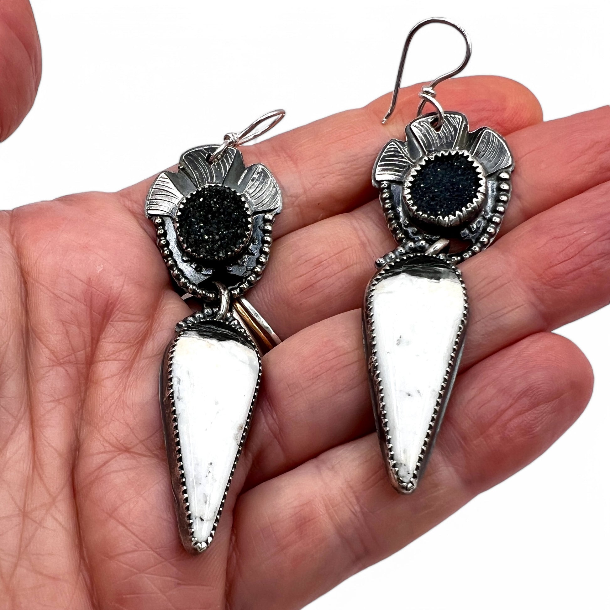 One of a kind, handcrafted sterling silver earrings with sparkly, ethically, sourced, rugged, high-quality black druzy that has been sawed out in the back so you can see the smooth stones on the other side with really pretty predominantly white white buffalo turquoise with a little bit of black at the top.