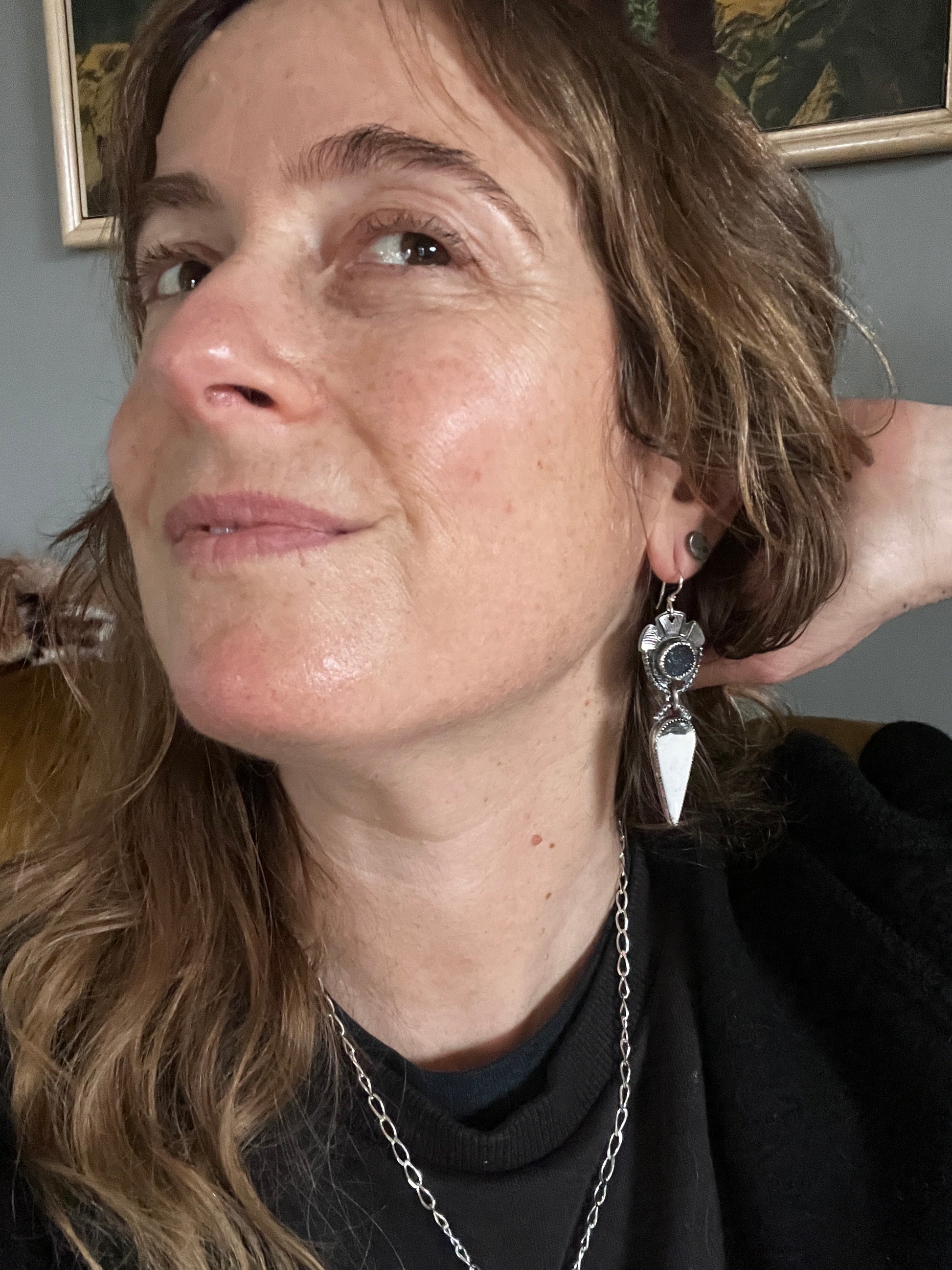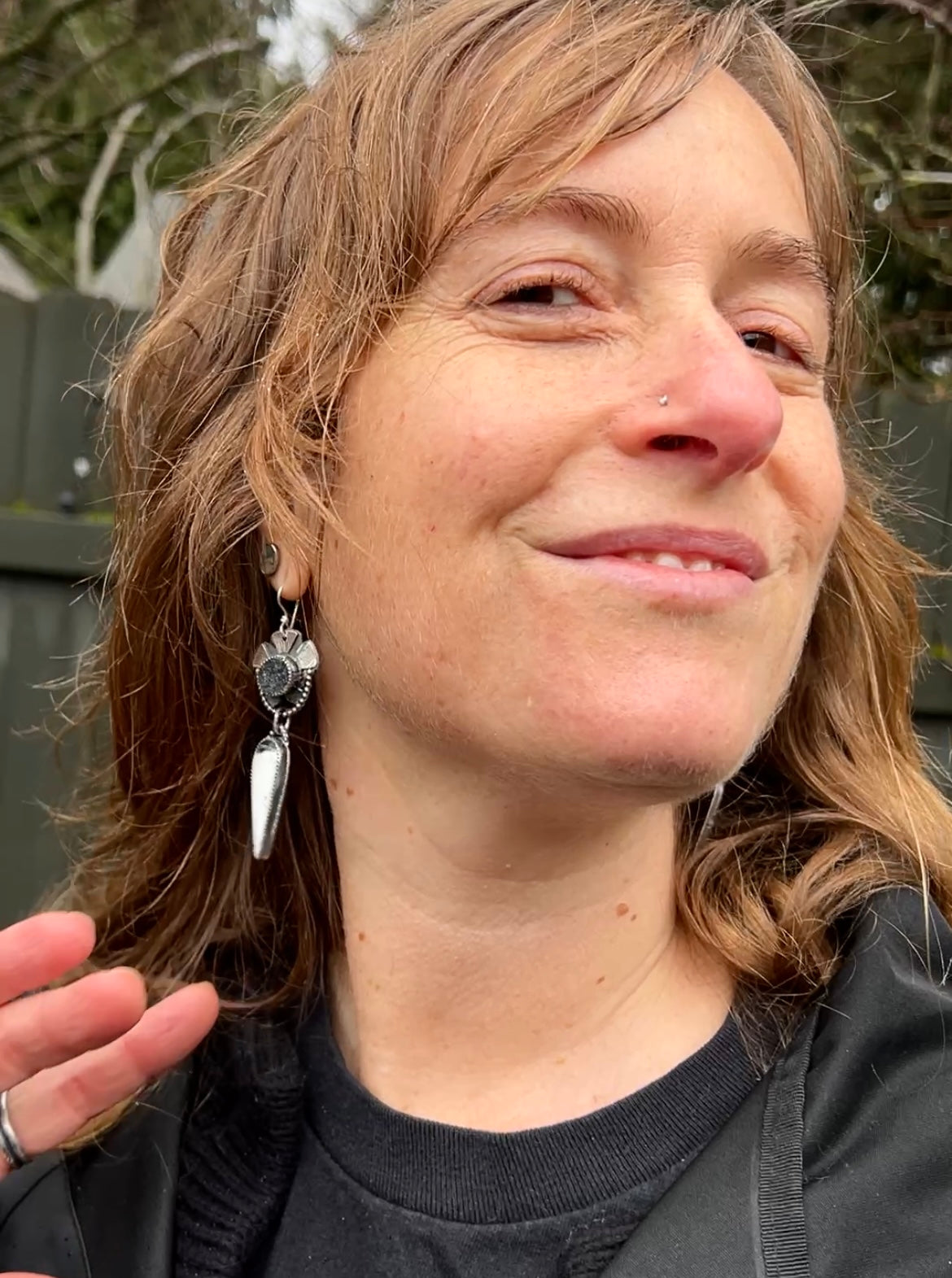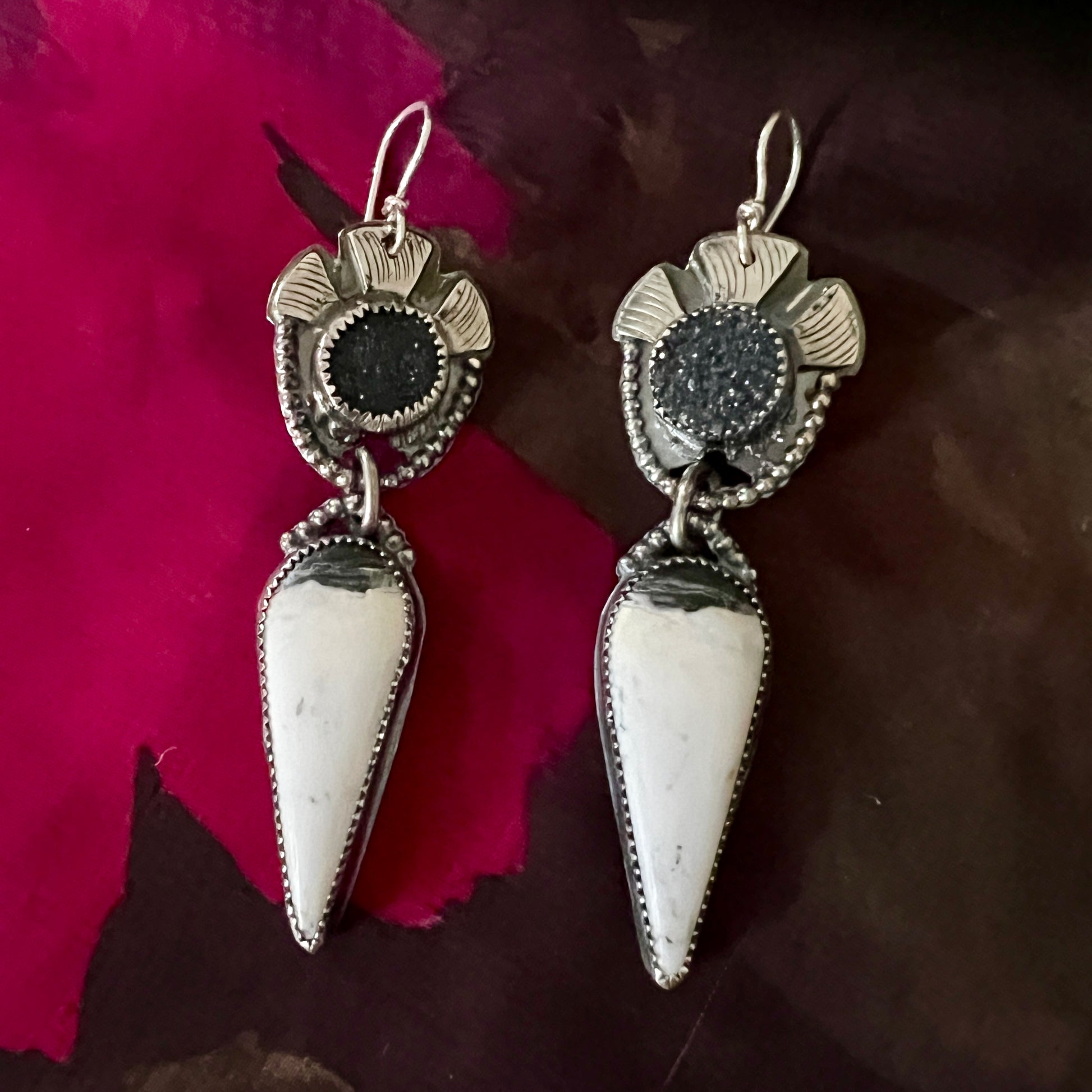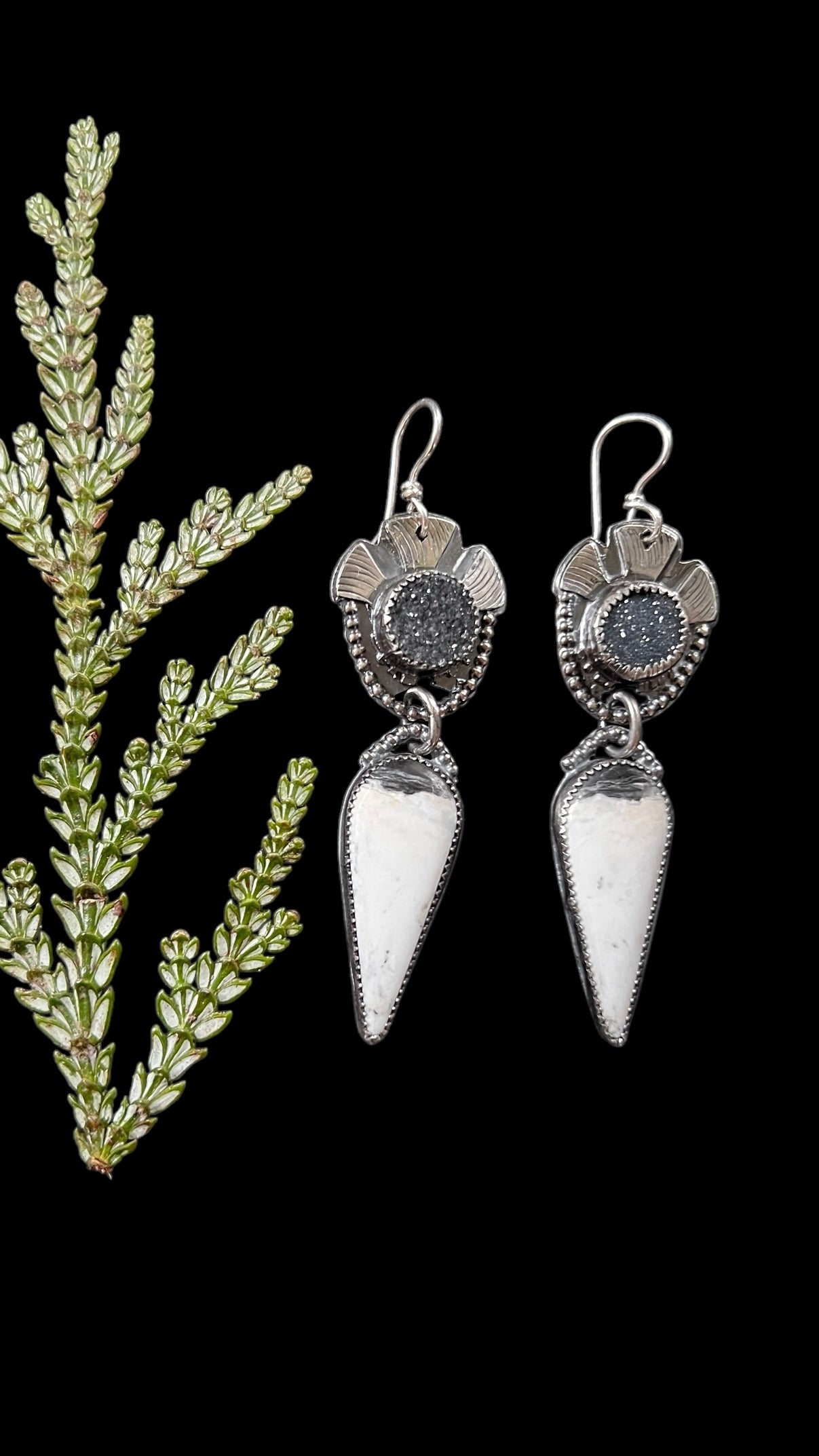 One of a kind, handcrafted sterling silver earrings with sparkly, ethically, sourced, rugged, high-quality black druzy that has been sawed out in the back so you can see the smooth stones on the other side with really pretty predominantly white white buffalo turquoise with a little bit of black at the top.