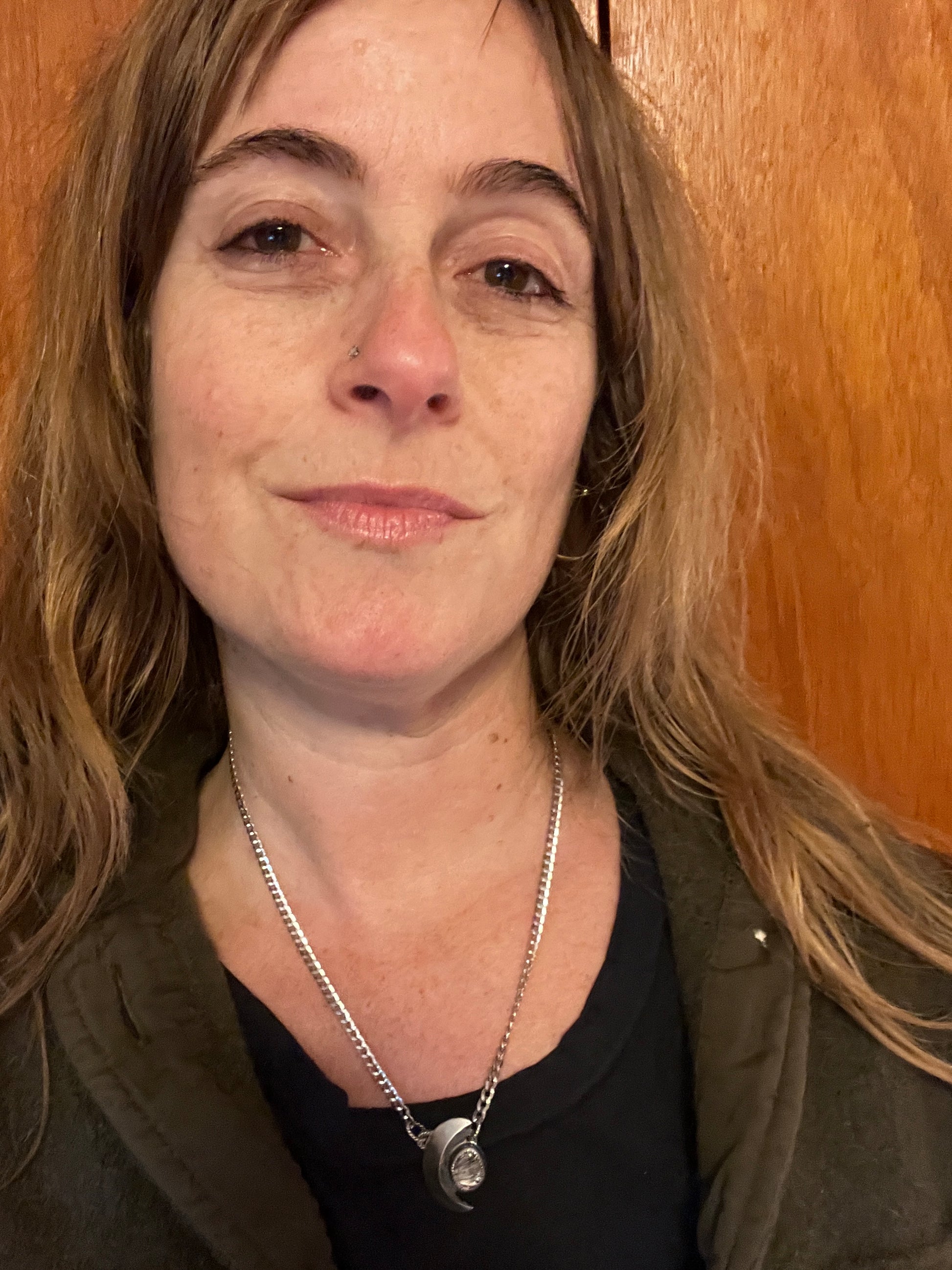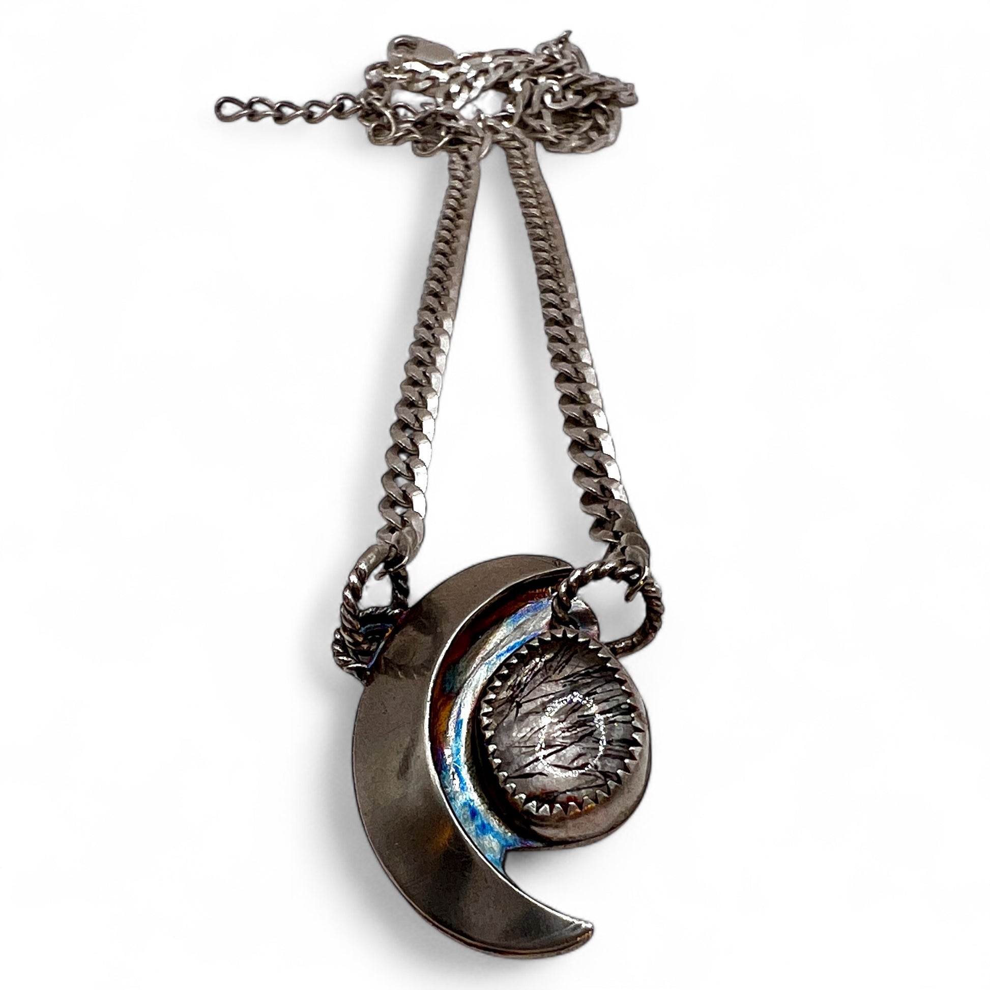 One of a kind, handcrafted, sterling silver necklace with black rutilated quartz and a domed crescent moon. The chain is a slender Italian sterling curb chain that can be worn between 18 to 20 inches long. The stone is smooth and ethically sourced.