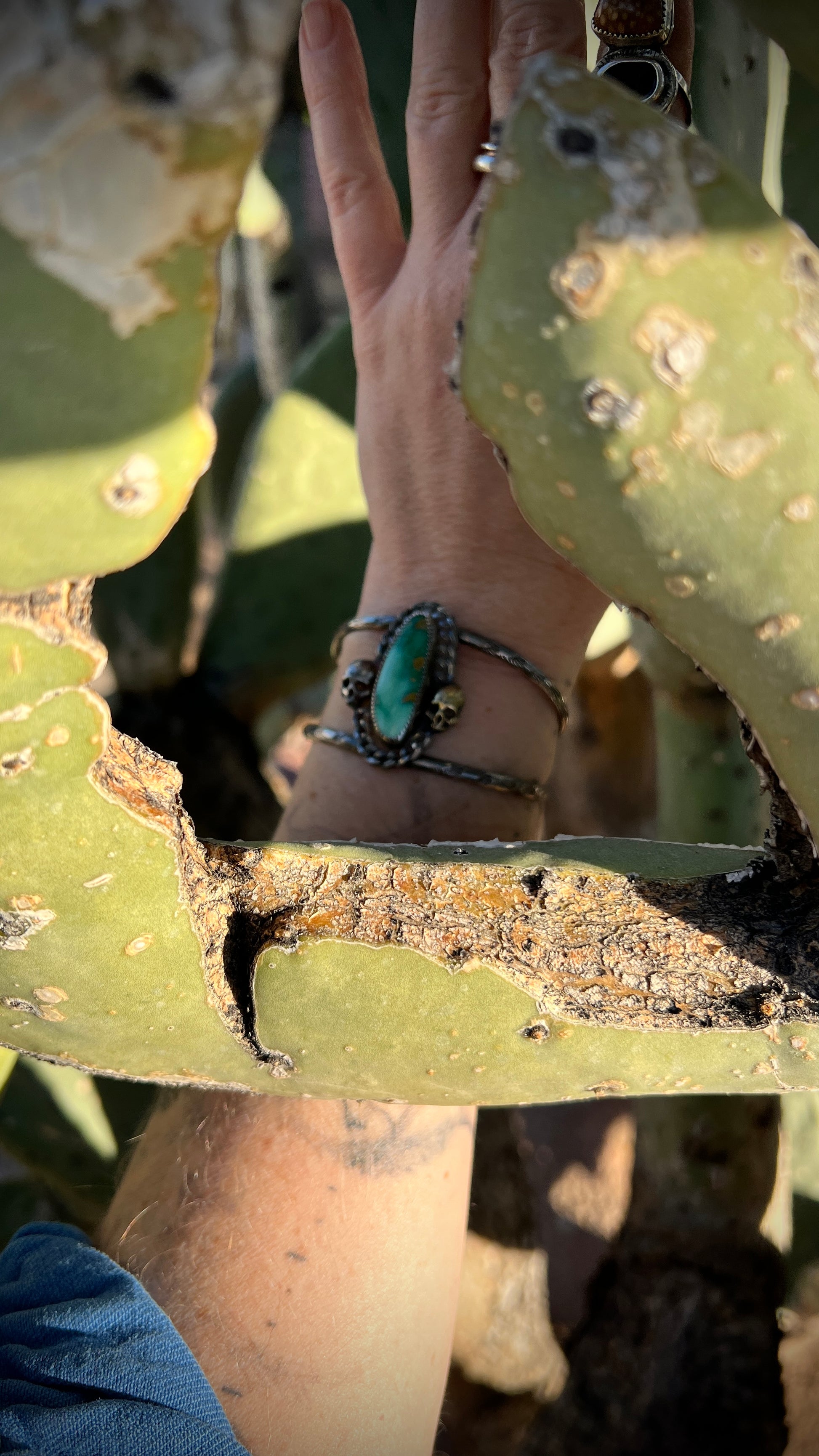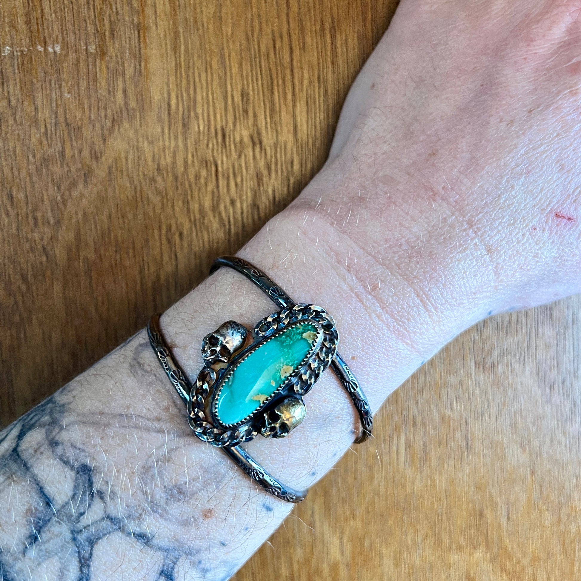 One of a kind, handcrafted sterling silver, sterling silver cuff bracelet with an absolutely gorgeous, bright stone of Broken Arrow Variscite from Nevada. I soldered 2 lost wax cast skulls along side the stone; one of sterling silver & one of brass.