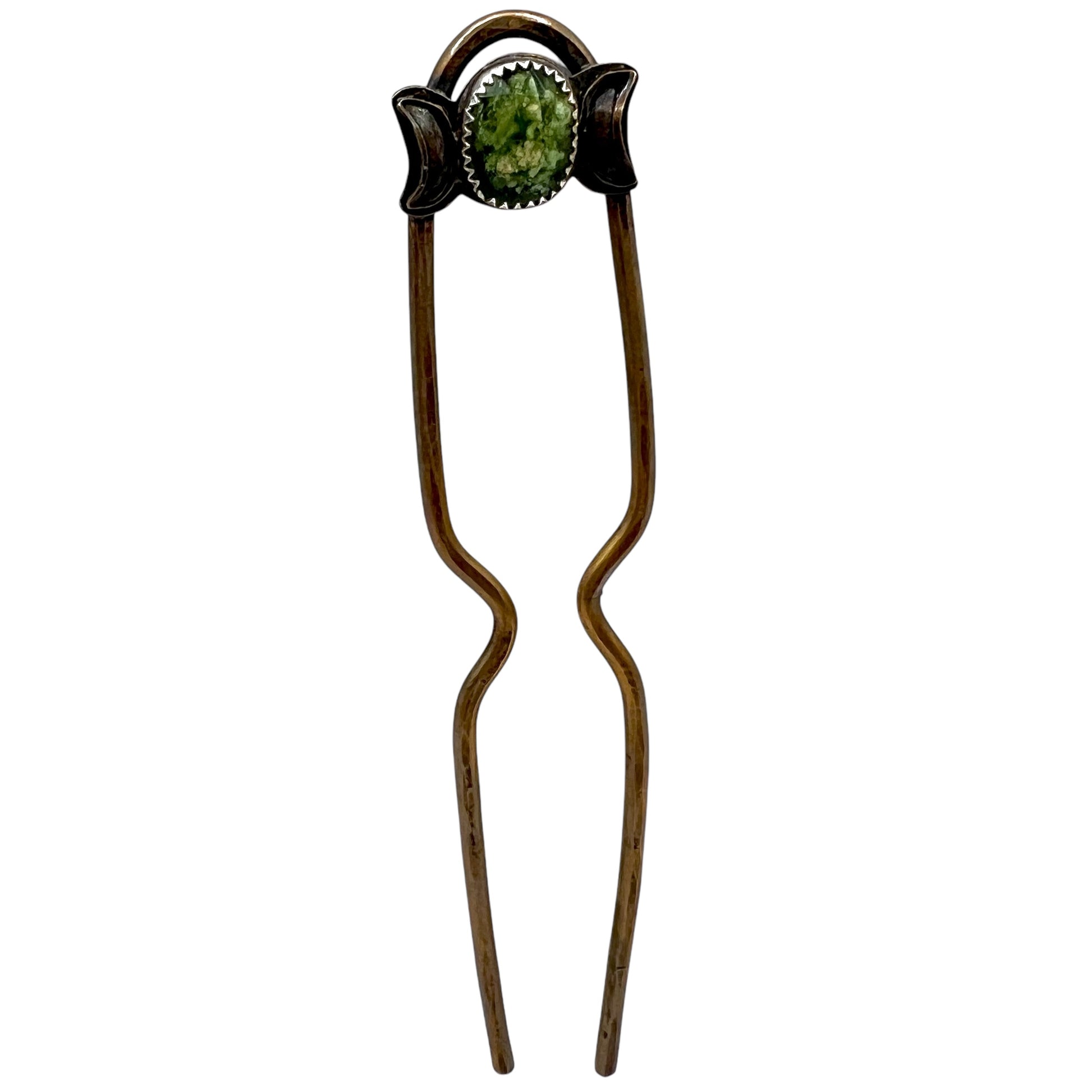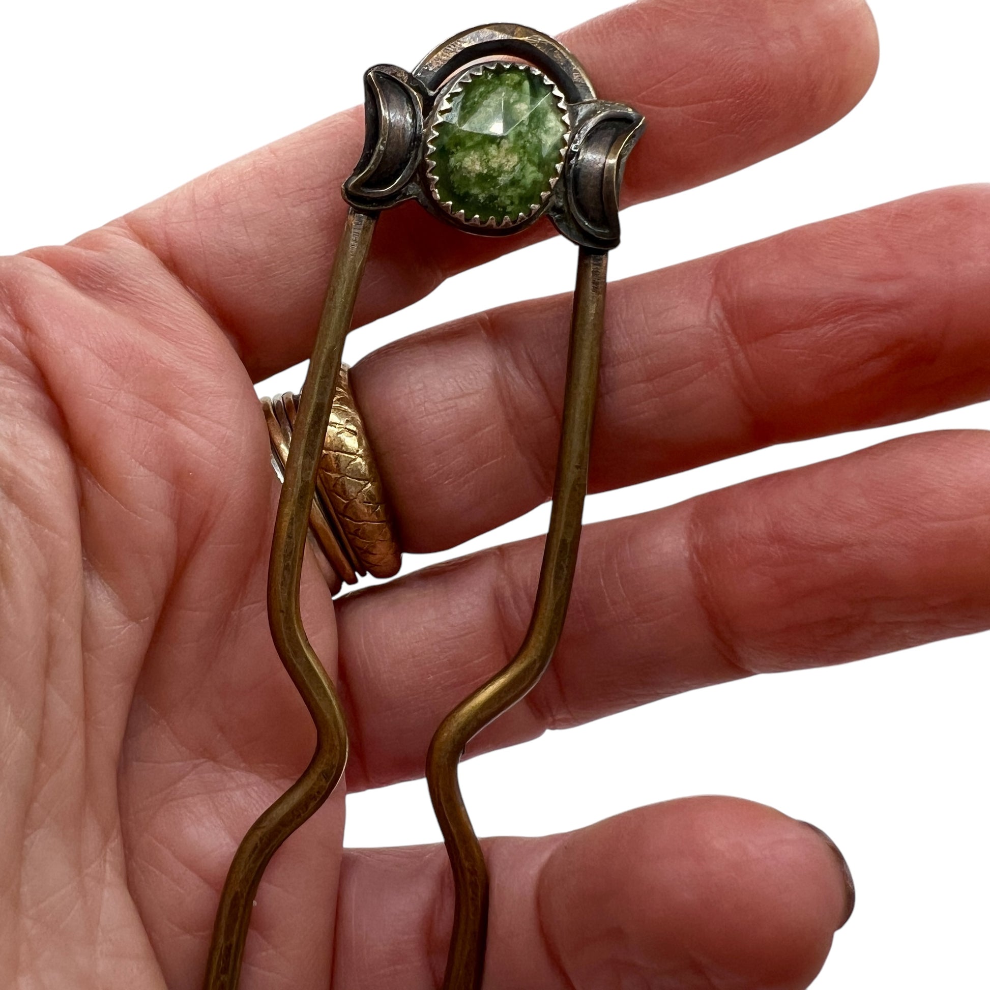 One of a kind, handcrafted brass hairpin with sterling bezel holding a faceted, ethically sourced piece of serpentine.