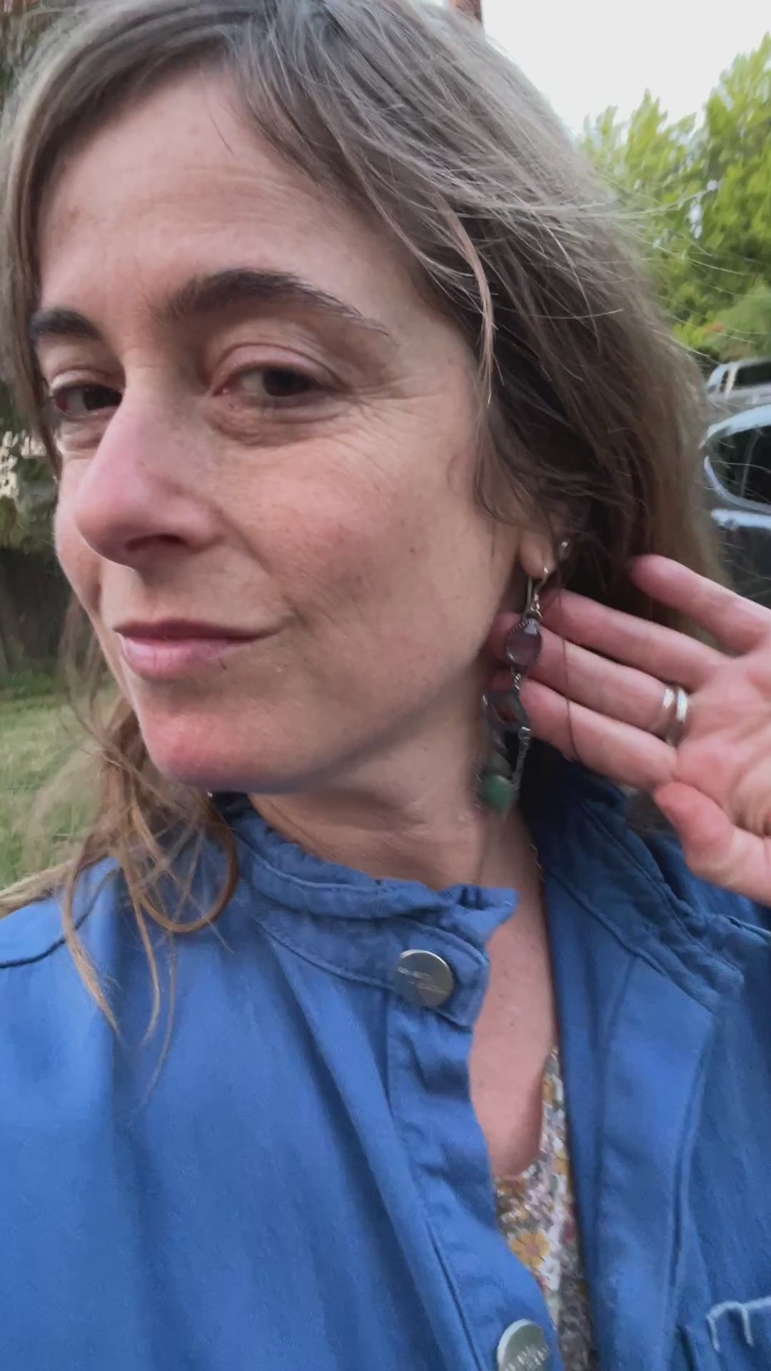 One of a kind, handcrafted, sterling silver earrings that have been stamped, sawed and soldered, with beautiful, faceted, see-through fluorite stones that range from oceanic green/ blue/ clear & purple. A mesmerizing stone! They also have greenish Nacozari turquoise from Arizona that I sawed out the backs of to make them lighter & also to be able to enjoy the color from both sides.