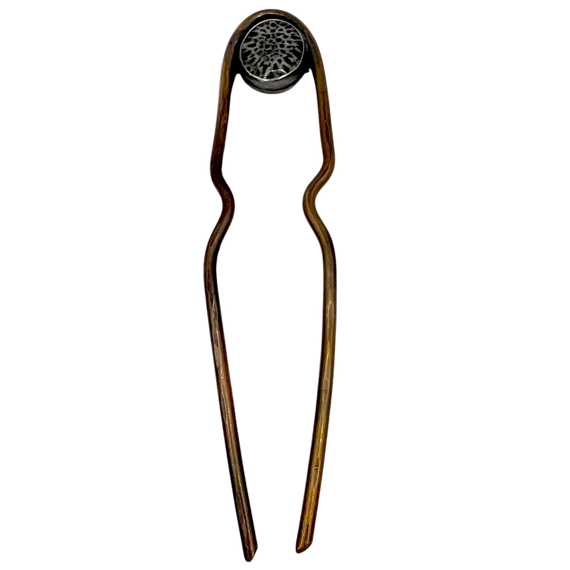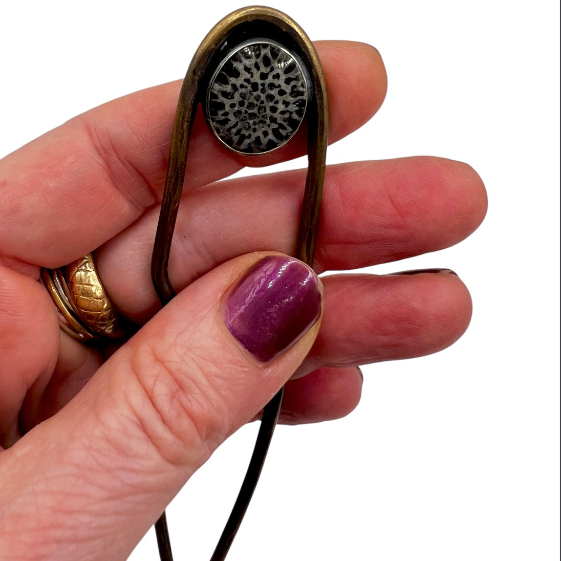One of a kind, handcrafted brass hairpin with sterling bezel holding a smooth piece of fossil coral.