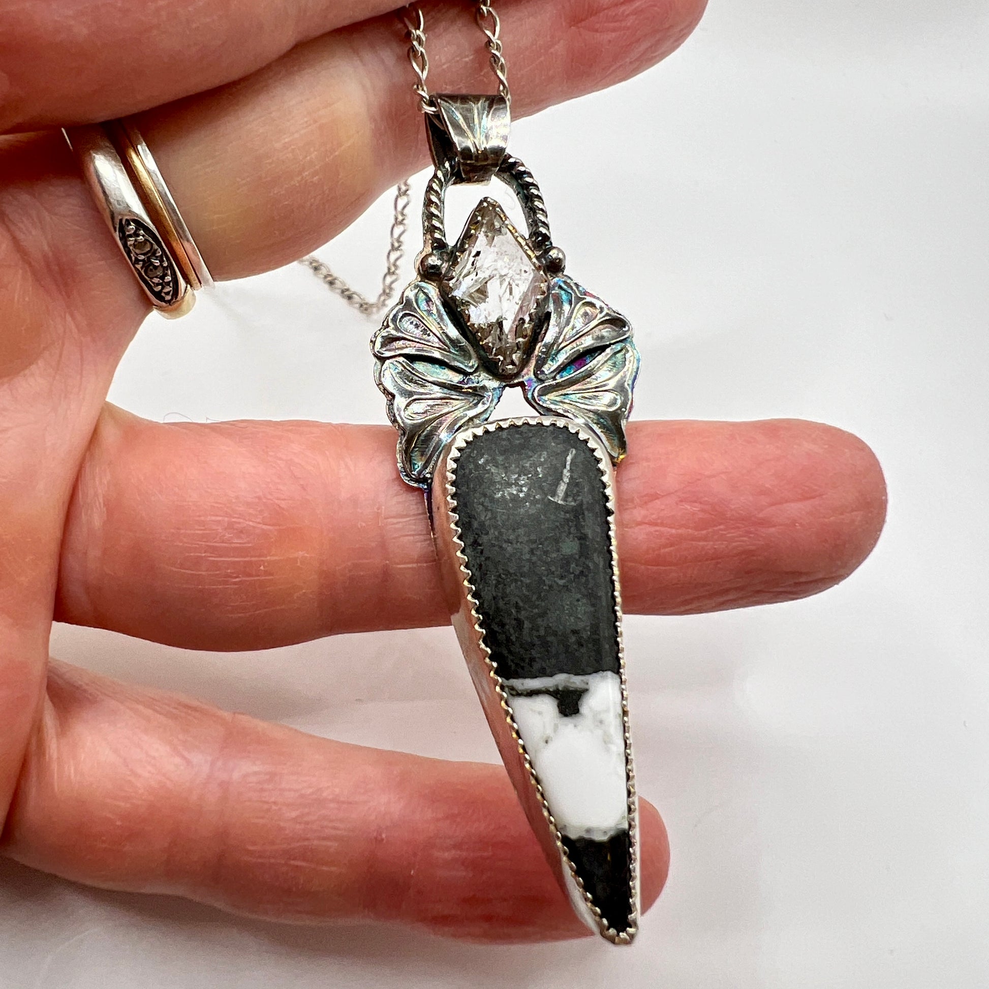 One of a kind, handcrafted sterling silver necklace. The pendant is 2.5” long. The sterling chain is adjustable & can be worn up to 22” long, with a small raw Herkimer diamond that hangs down your back.