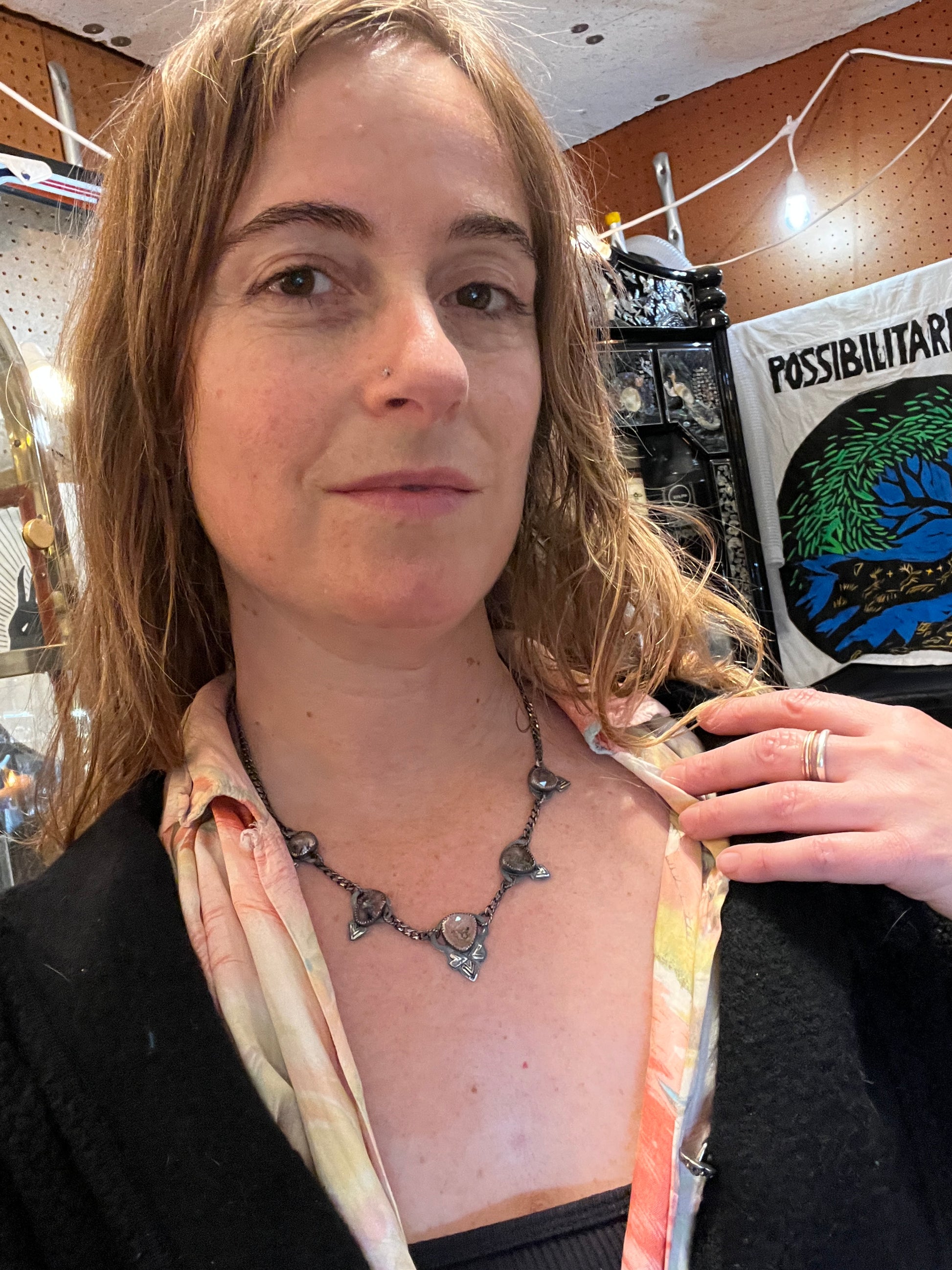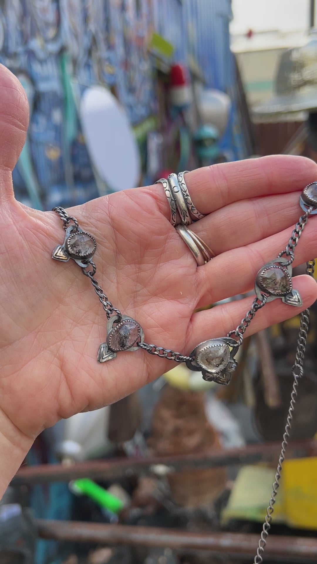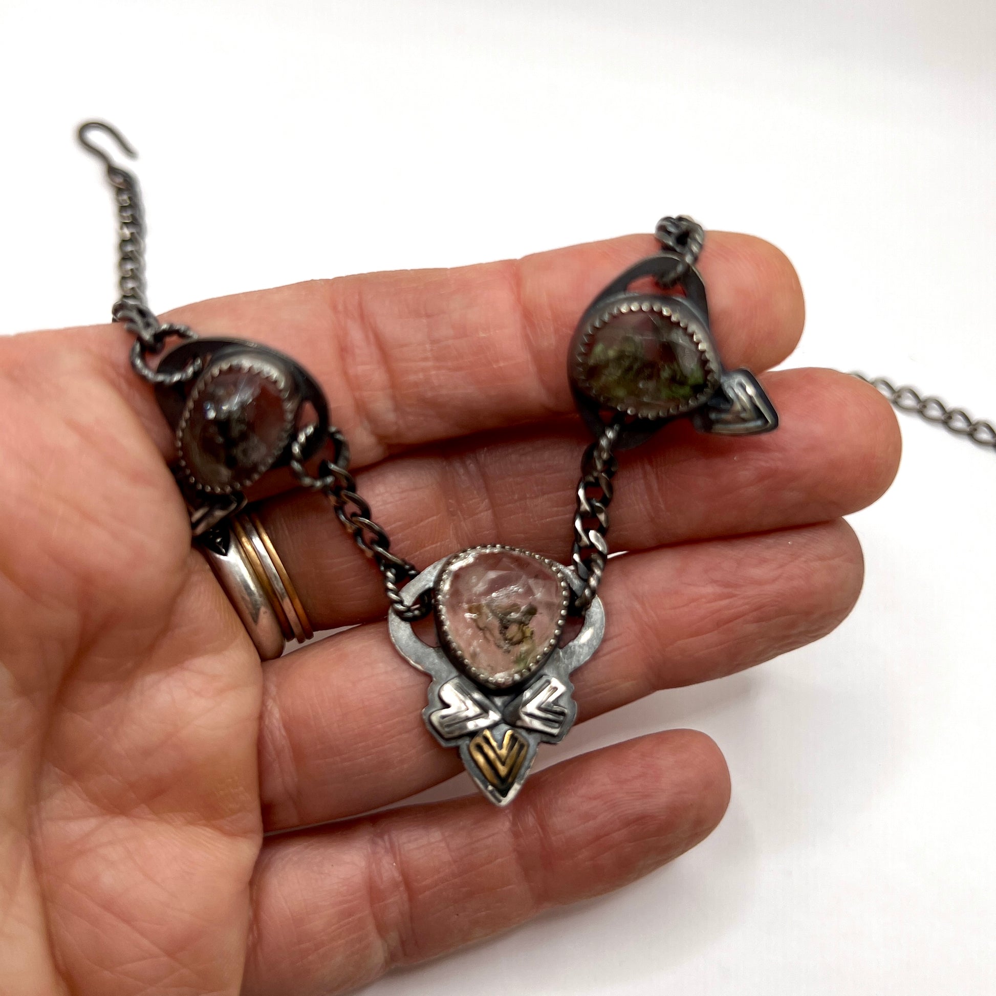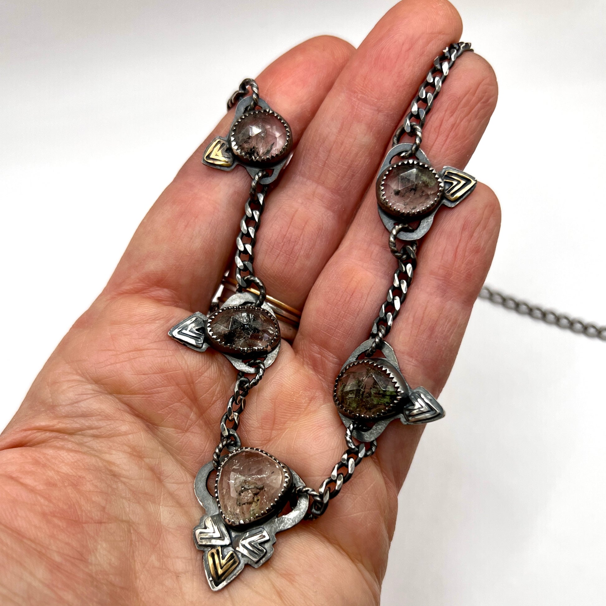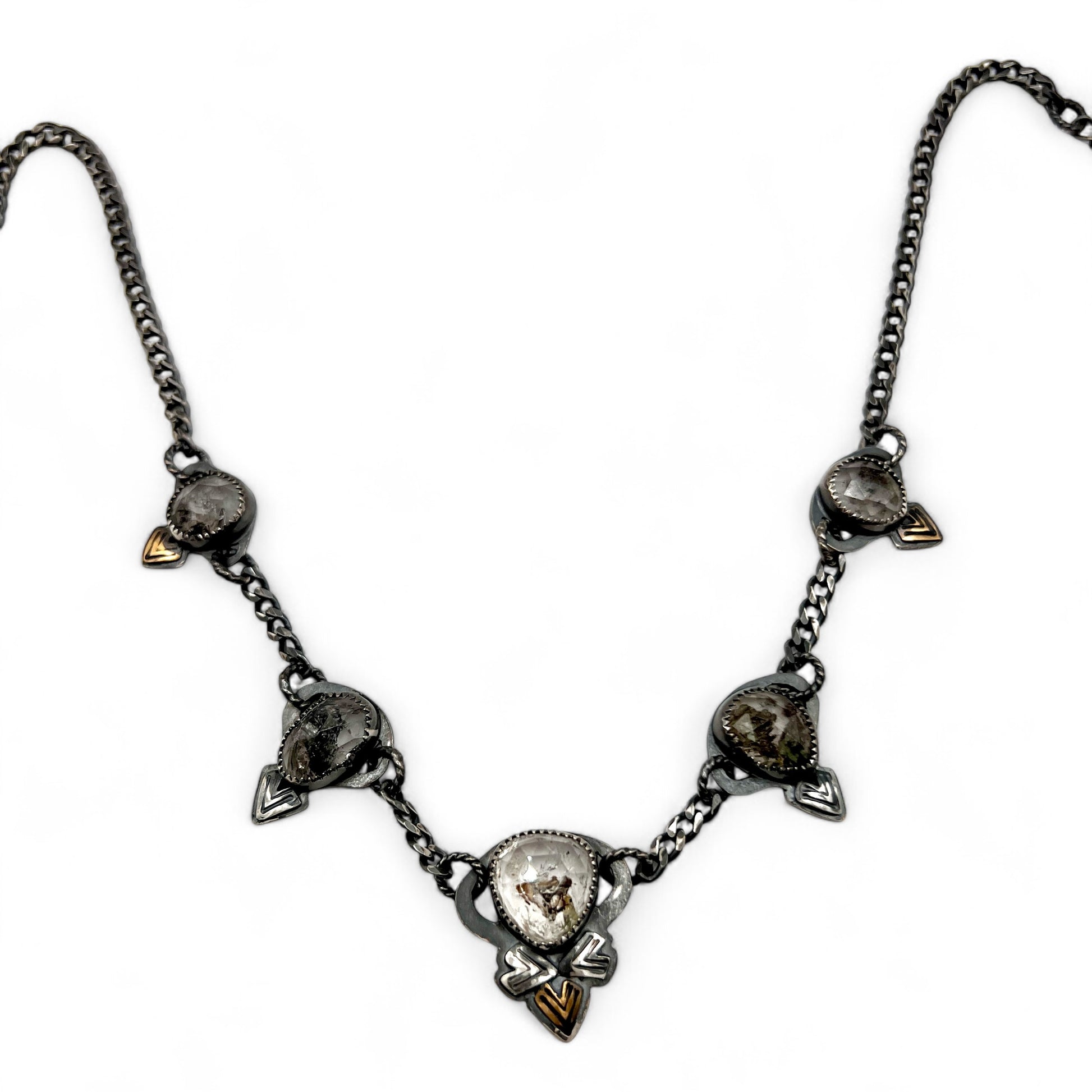 One of a kind, handcrafted necklace with 5 ethically sourced and faceted Herkimer diamonds. The bacts have been sawed out so you can see all the beautiful inclusions in the stones.