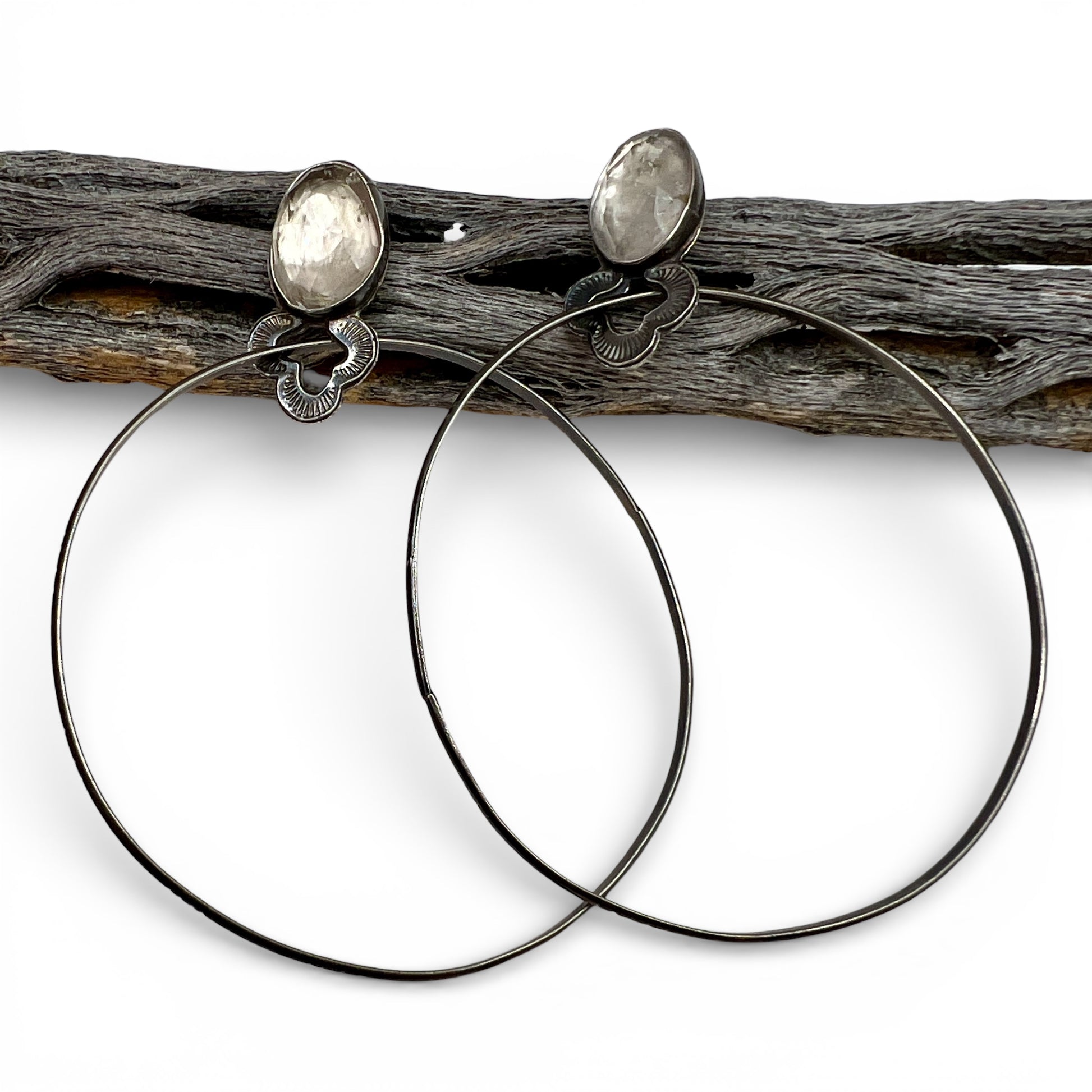 One of a kind, handcrafted, sterling silver stud hoop earrings with beautiful , faceted, ethically sourced herkimer diamonds .