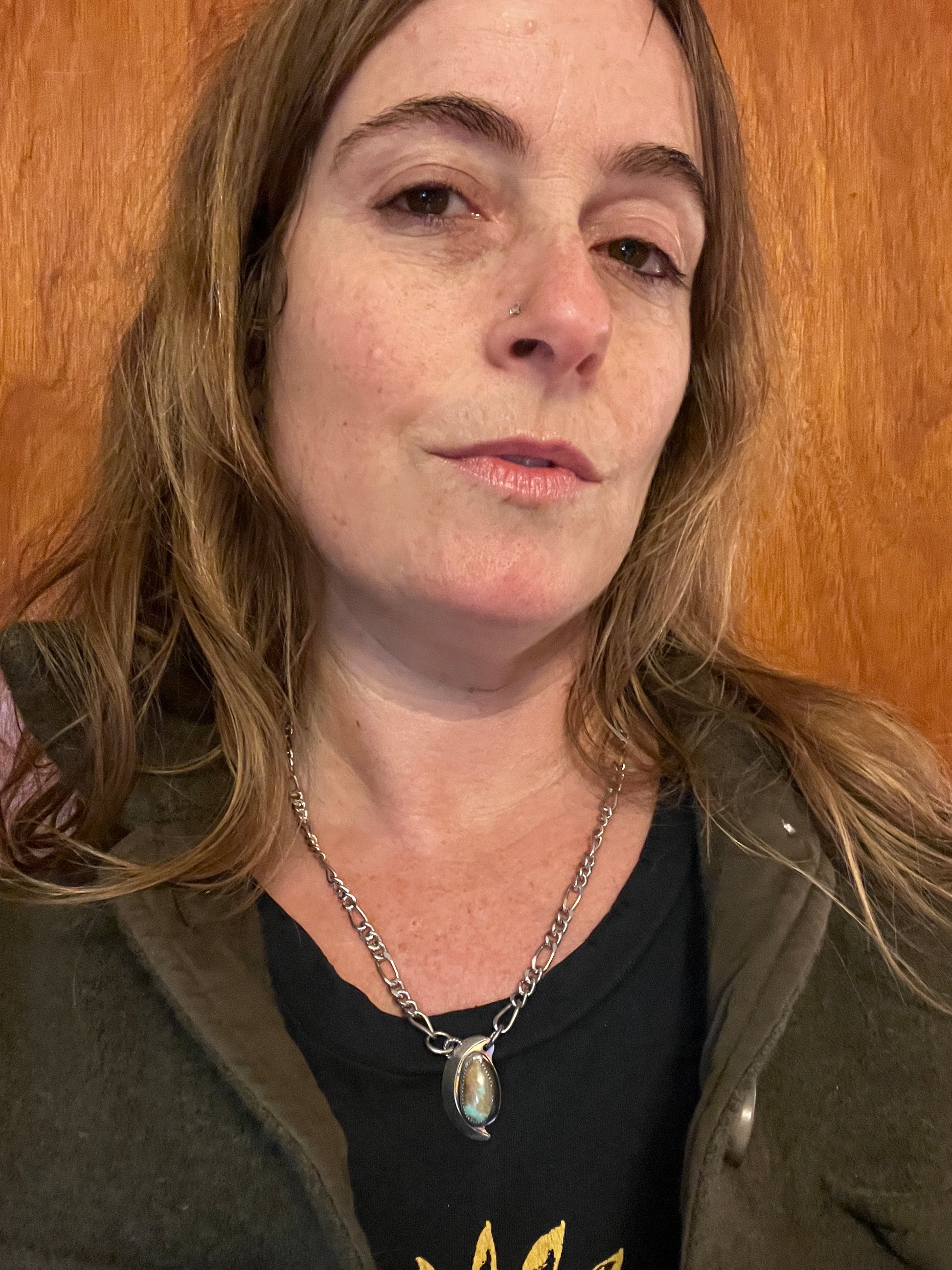 One of a kind, handcrafted, sterling silver necklace with Kingman, Arizona turquoise and a domed crescent moon with thick Italian sterling curb chain. The length can be adjusted from 18 to 19.5” long.