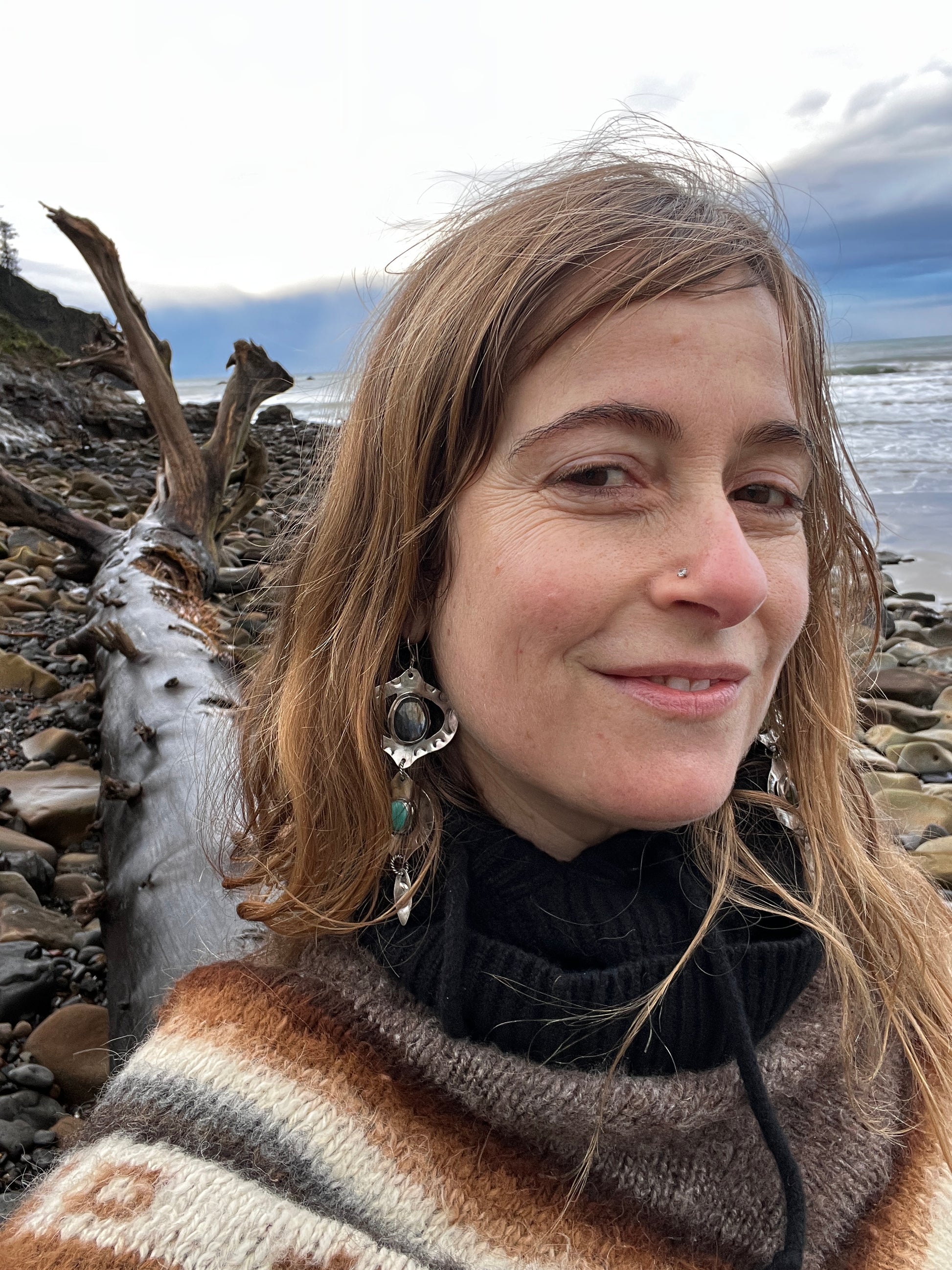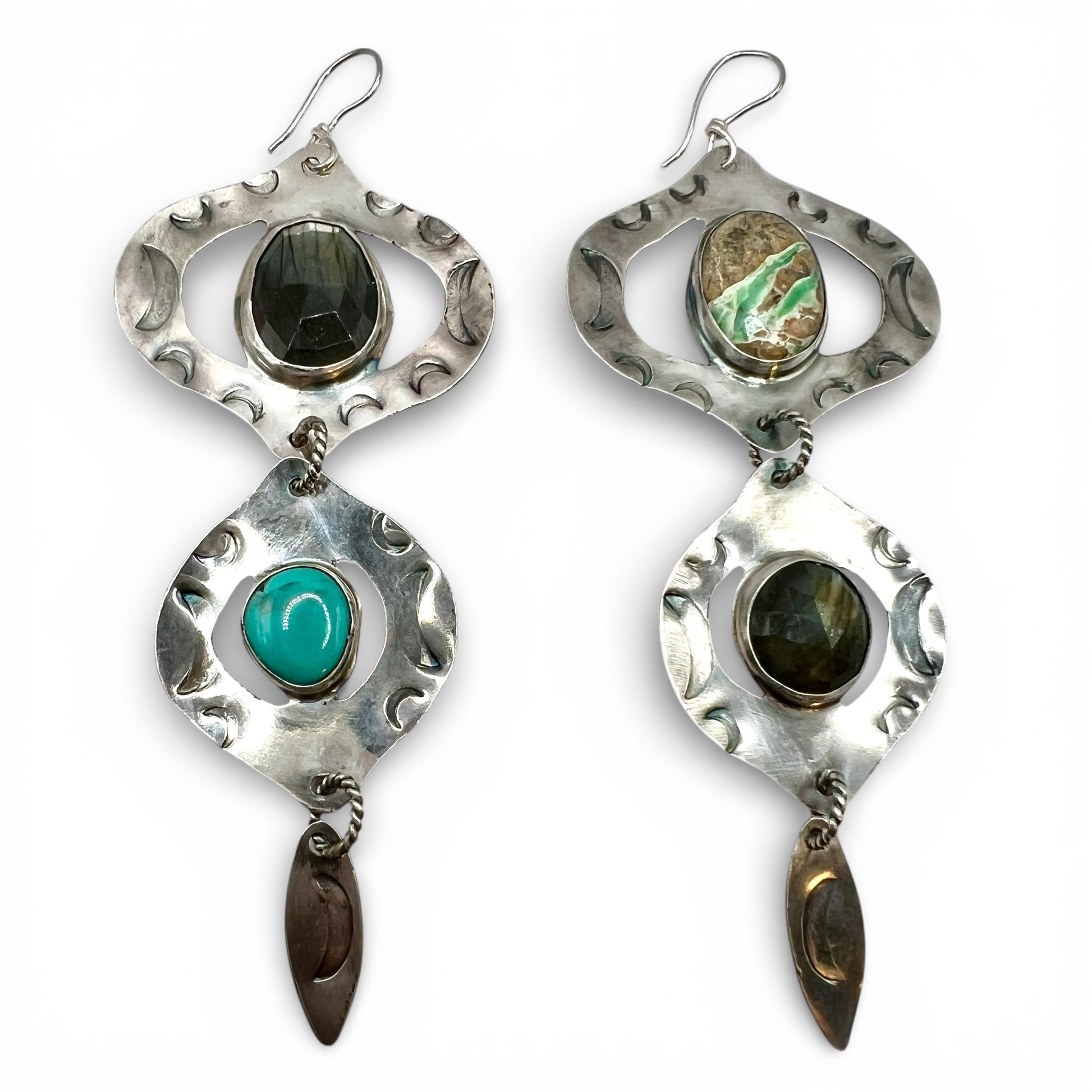 One of a kind, handcrafted sterling silver earrings with stones of ethically sourced, faceted labradorite, royston ribbon turquoise & blue bandit turquoise (the smaller stone).