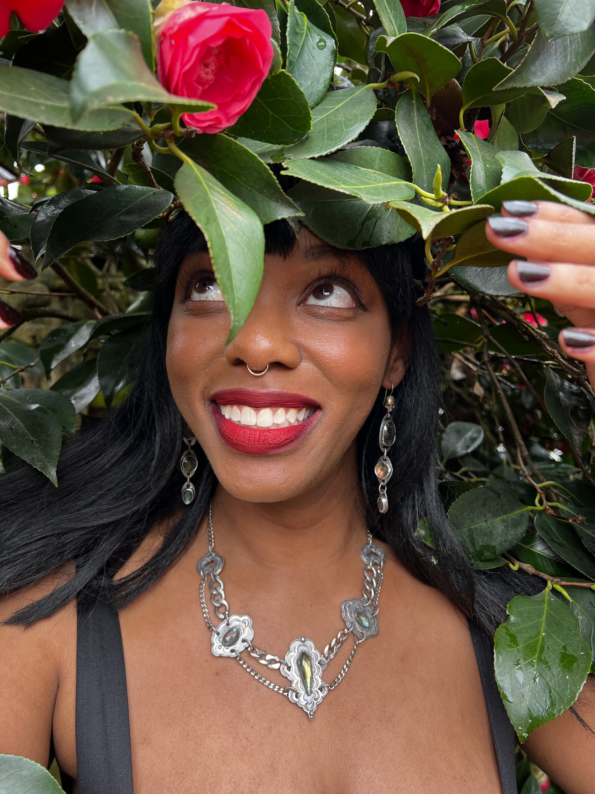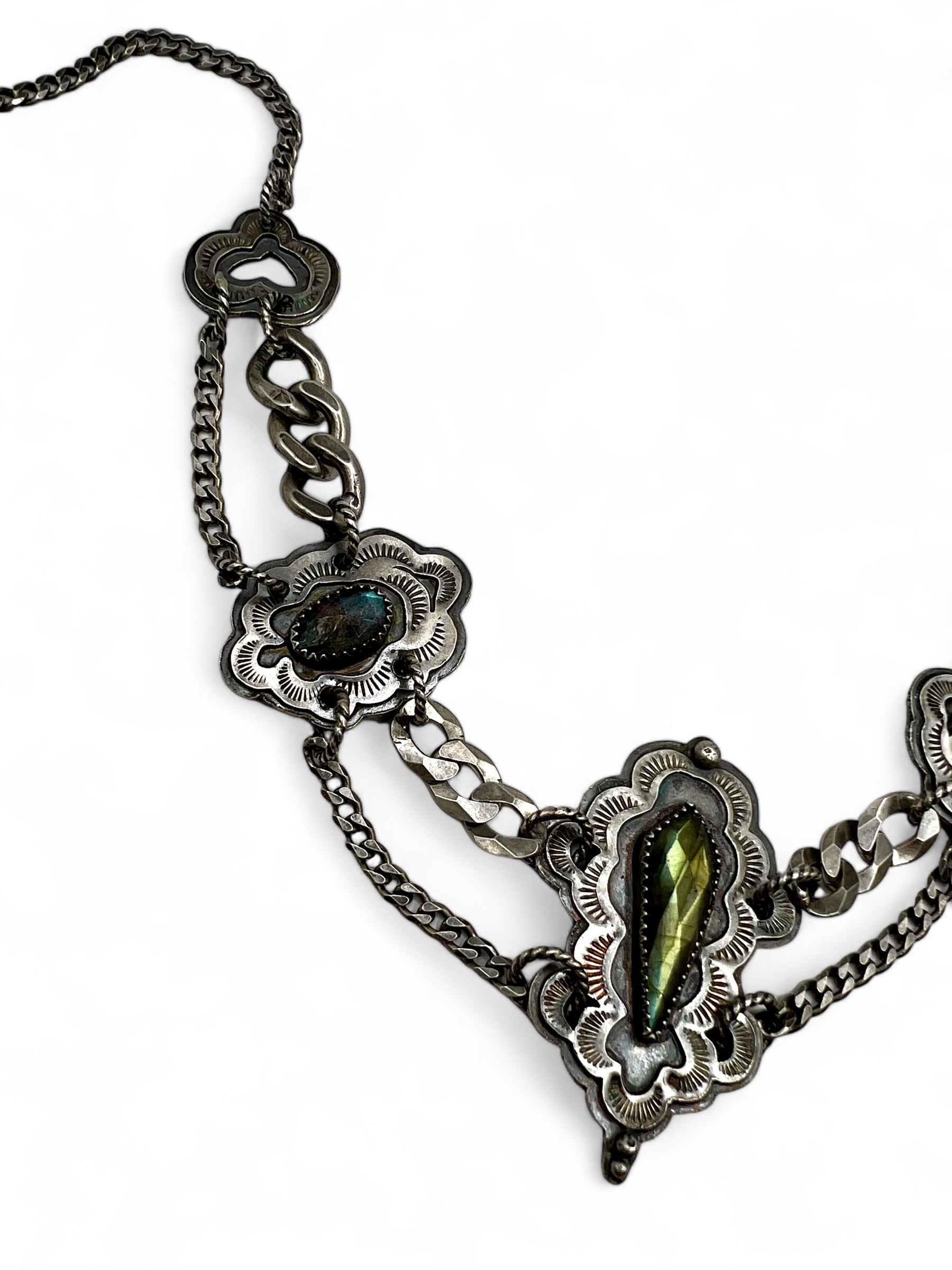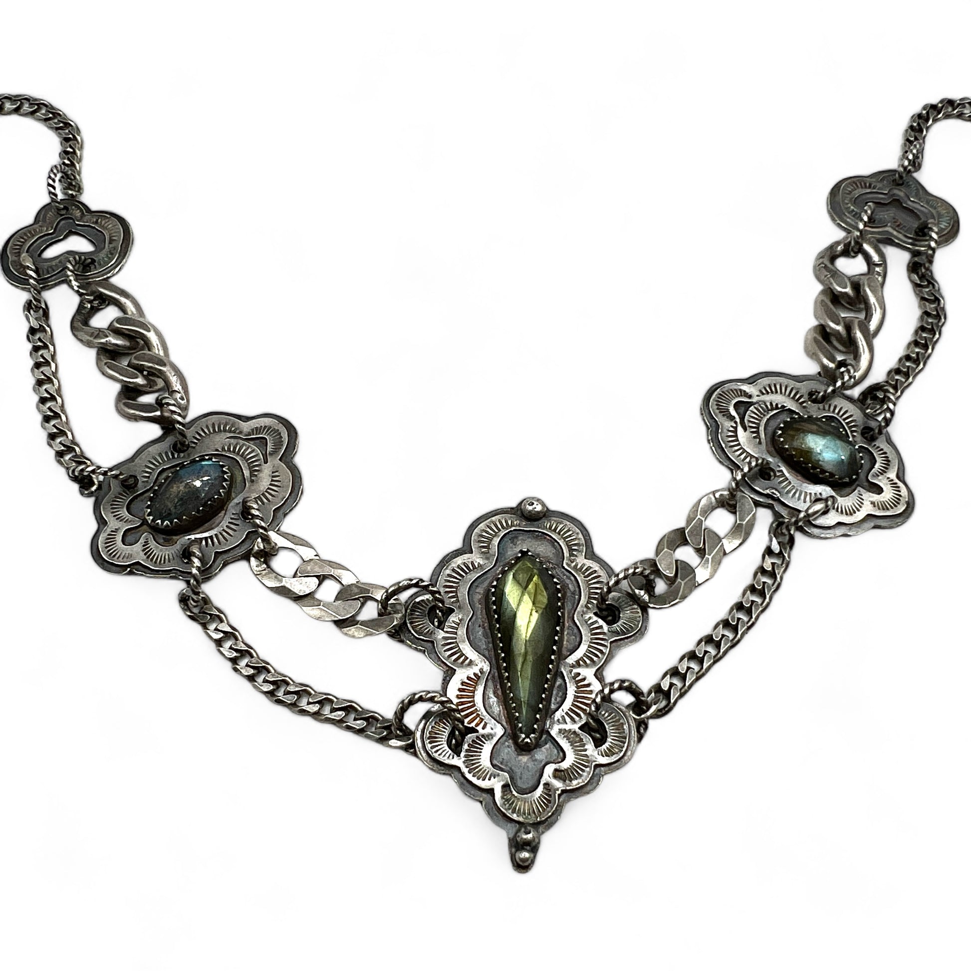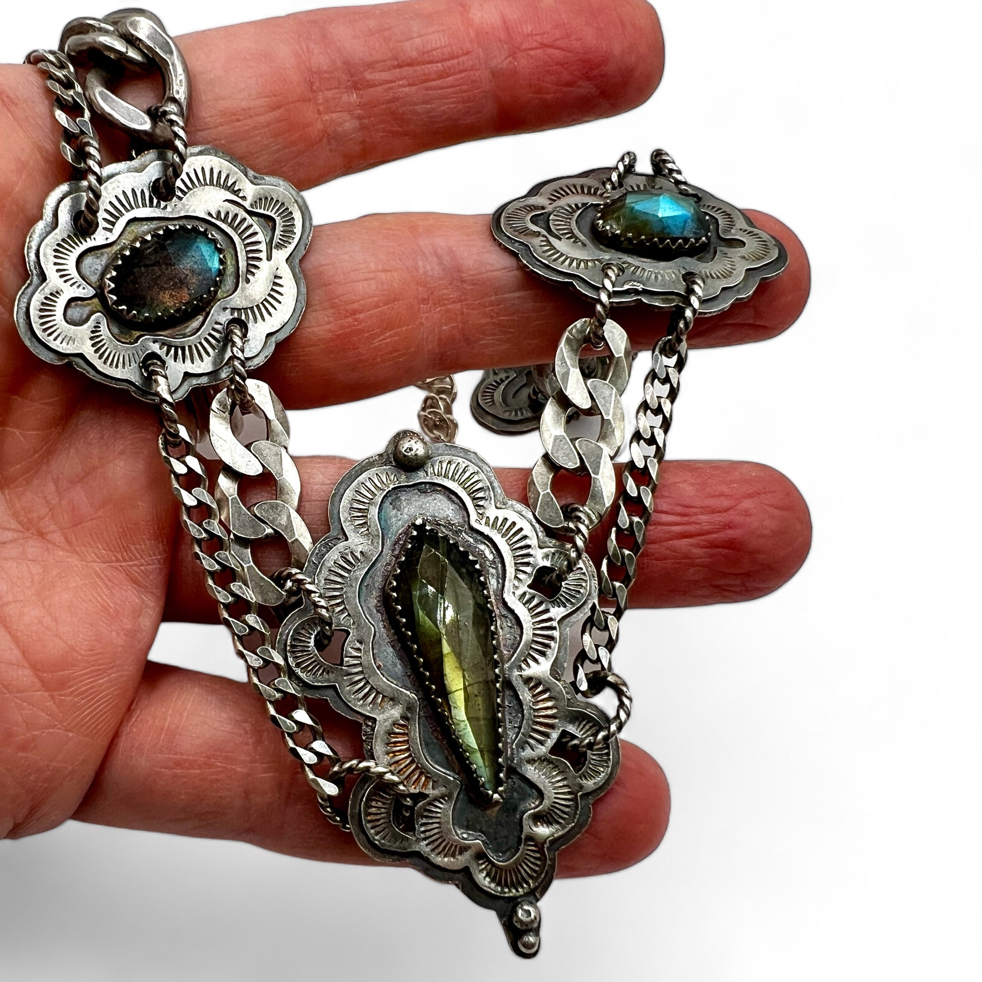 I’m really proud of this one. This is 3 pieces of ethically sourced, faceted labradorite stones with hand stamped & soldered segments & multiple chains.