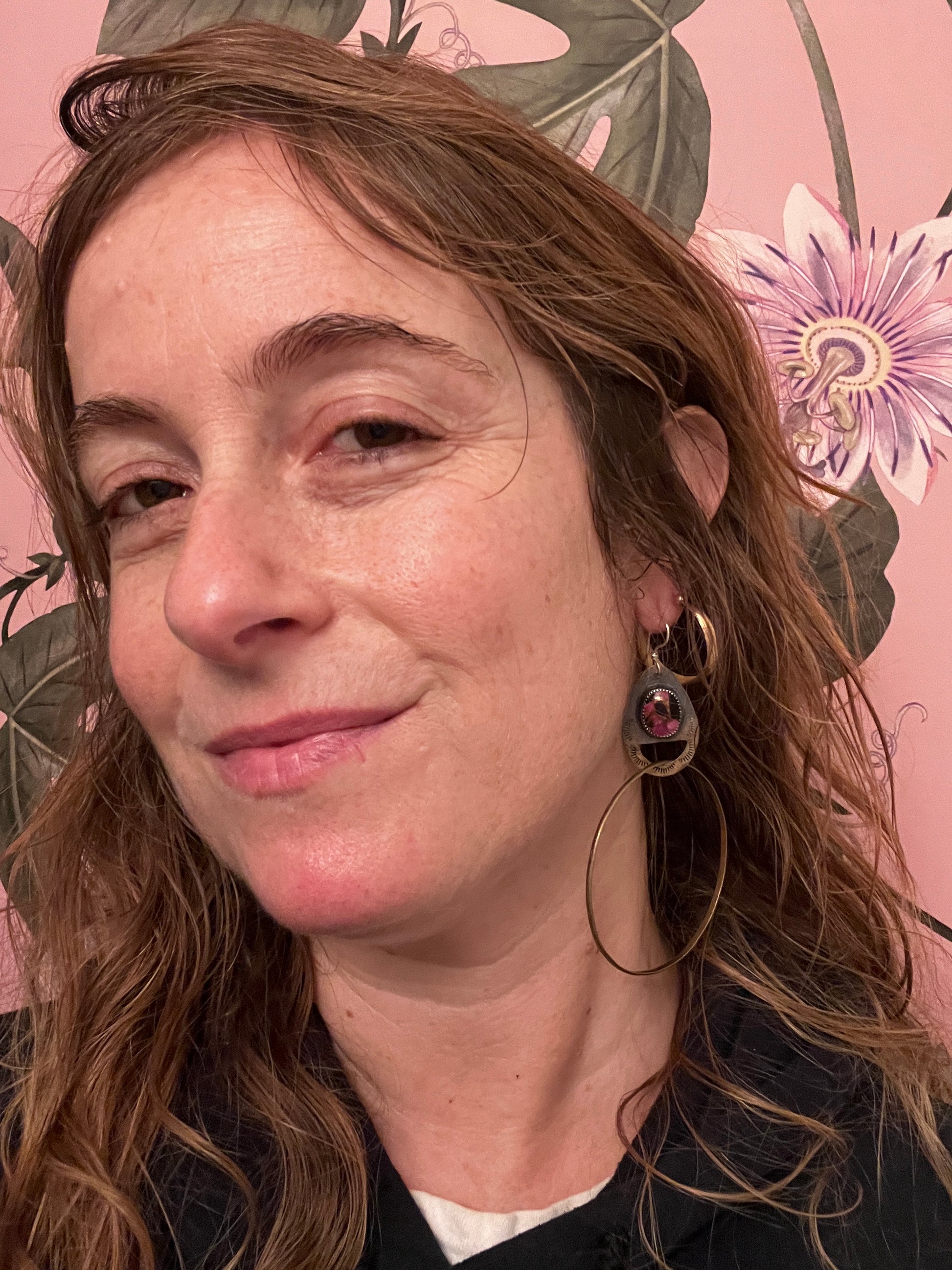 Just a touch over 4” long, one of a kind, handcrafted brass cenote hoops with sterling, hypoallergenic ear wires & pink calcite black onyx composite stones.