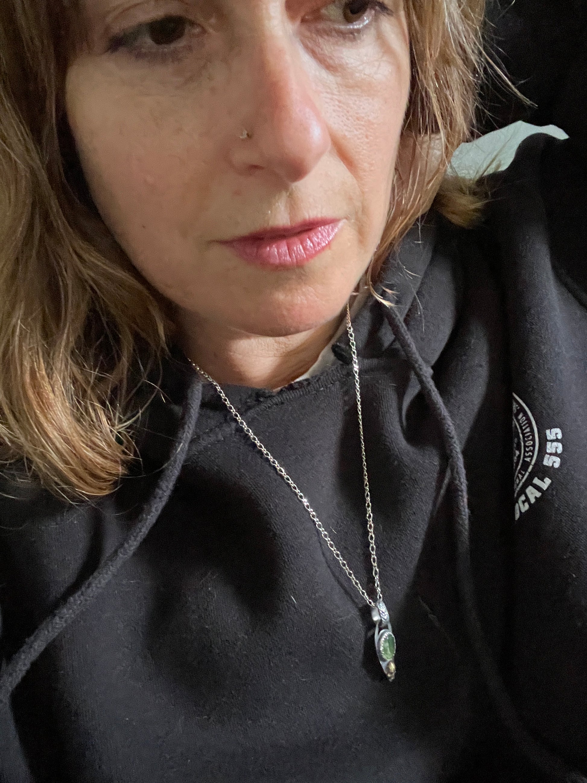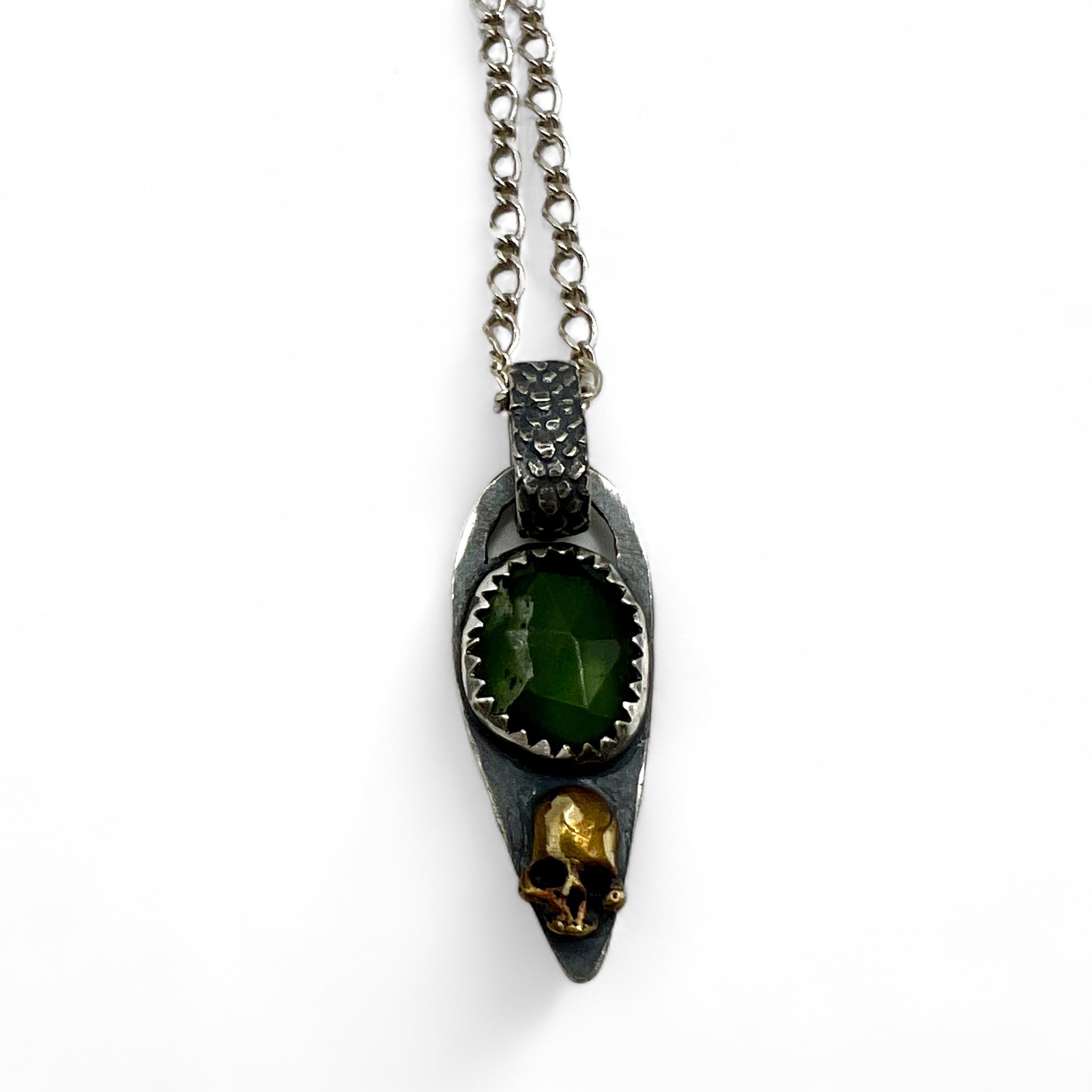 One of a kind, sterling silver necklace with brass skull on adjustable, 22” chain with Herkimer Diamond down the back. Ethically sourced, faceted serpentine stone.
