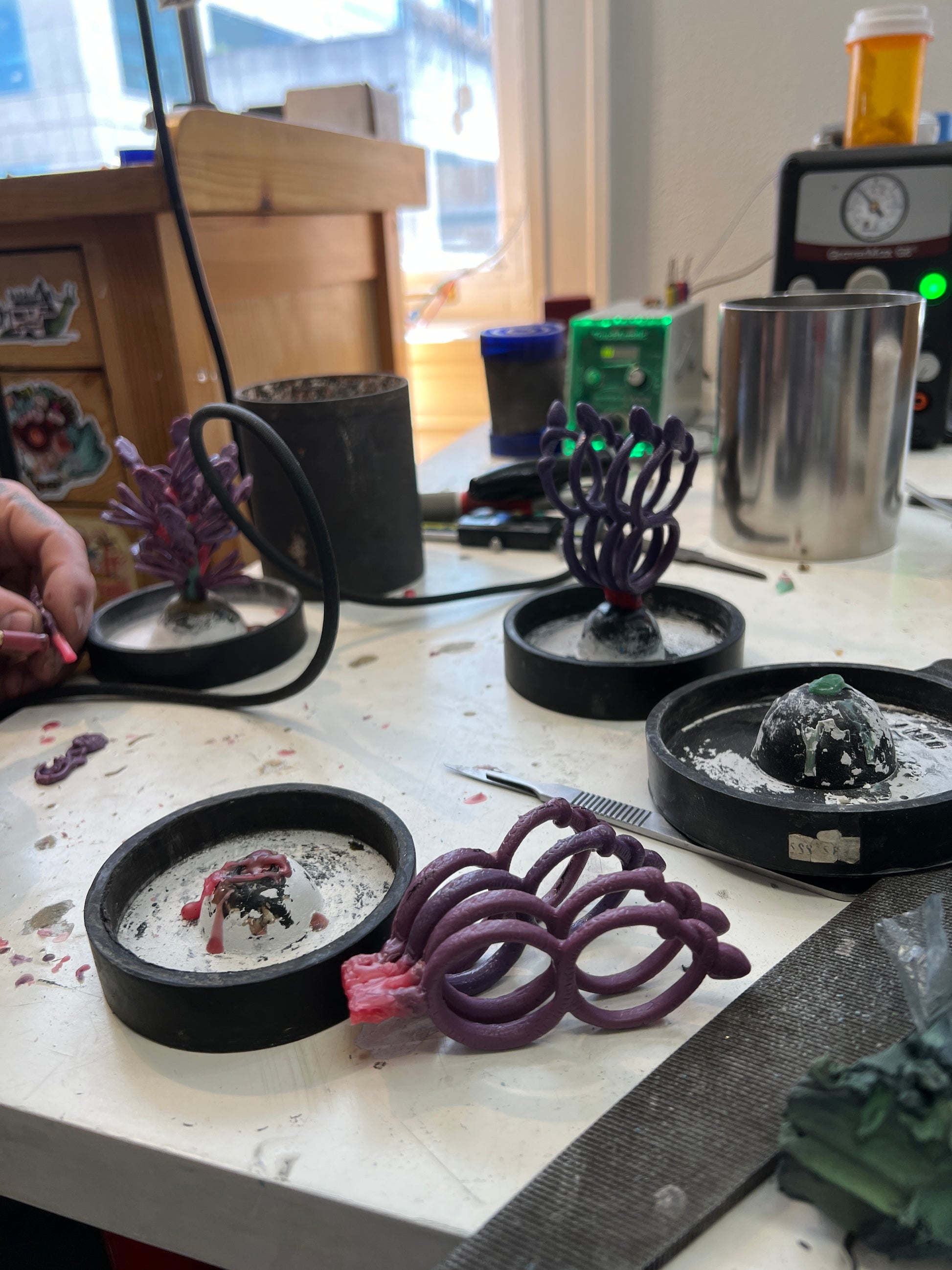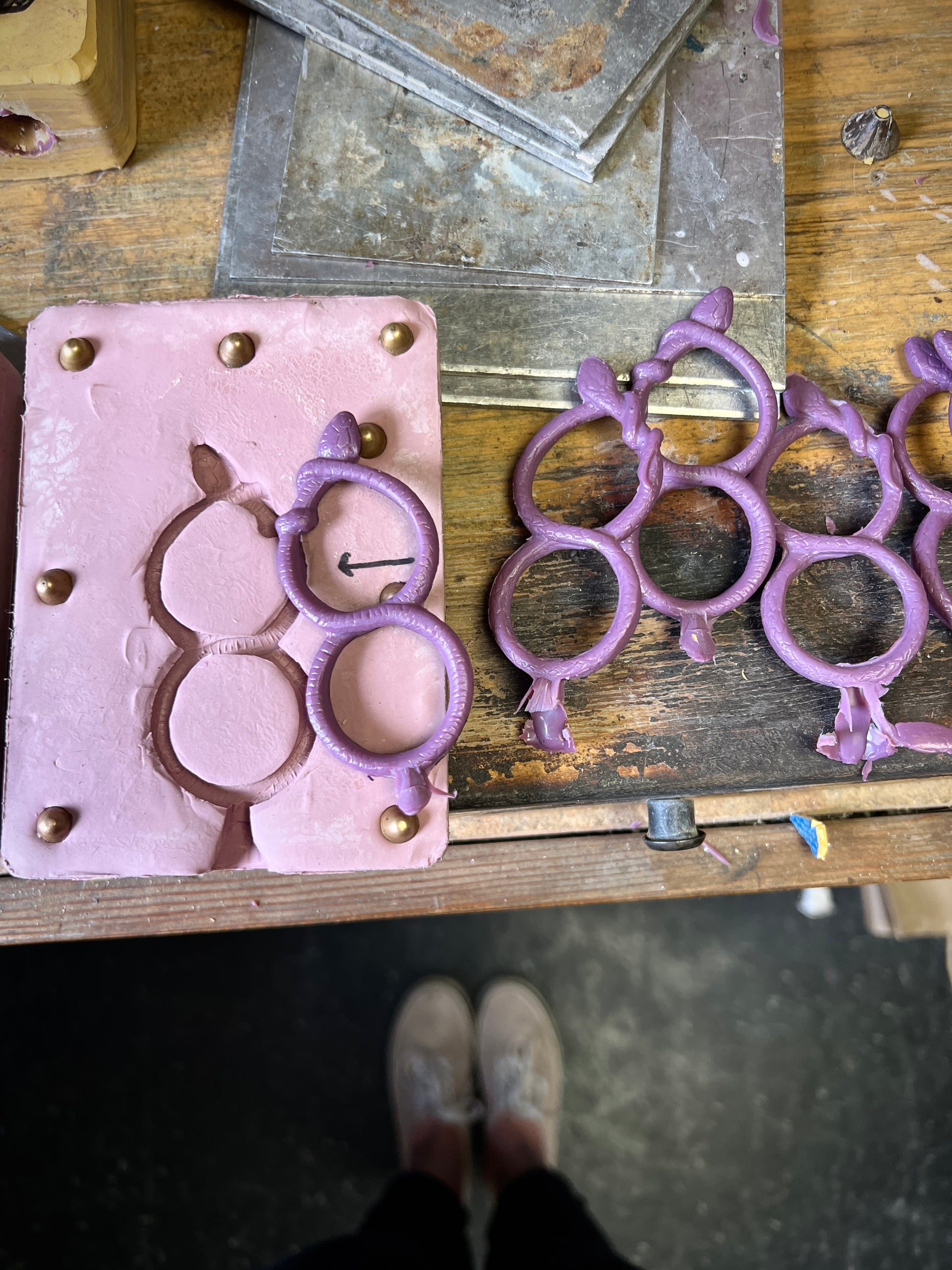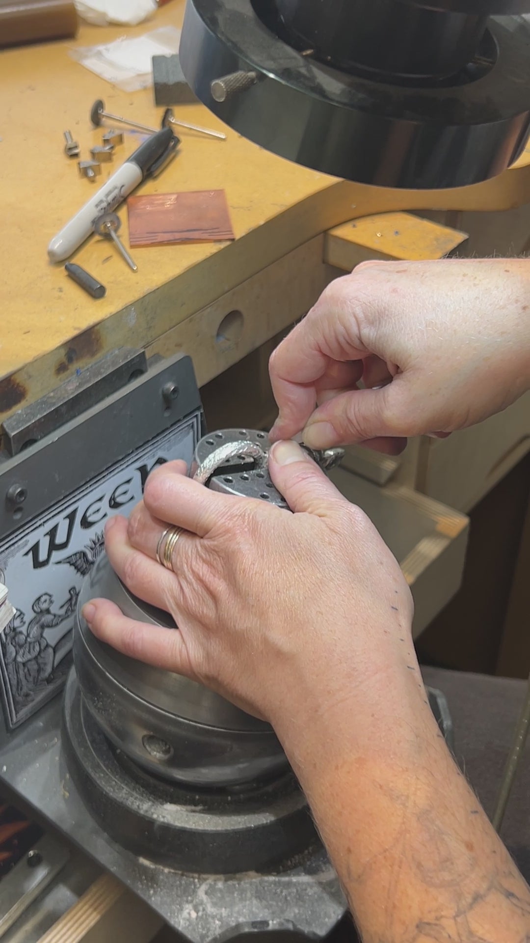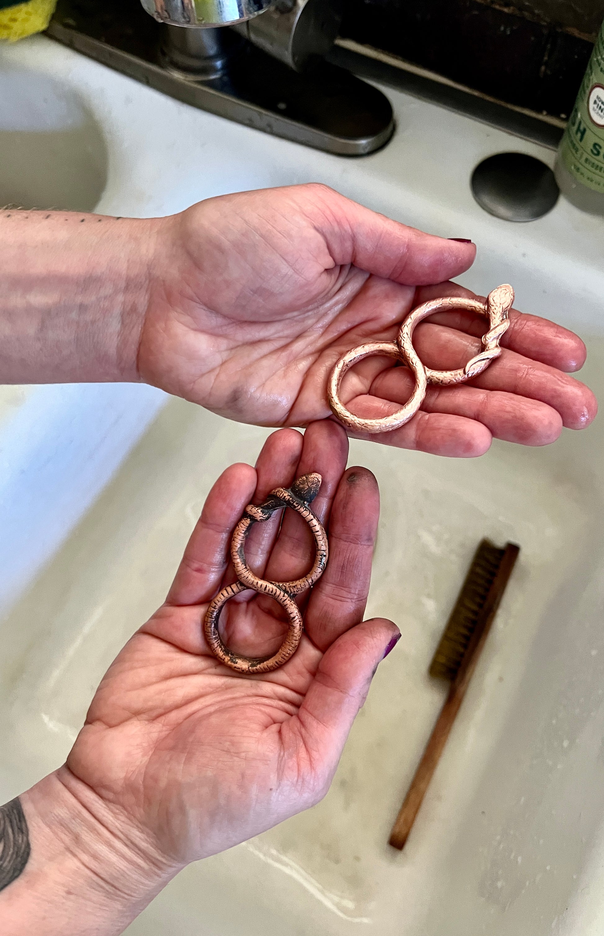 I hand carved the original from a block of wax (every step took so long!!!), then cast it with sterling as a master copy, made a mold of that, then squirted hot wax into the cast over & over & over (etc), then created a wax tree with them, cast the trees over & over, removed as much investment off the tree, sawed them off the tree, filed & ground off the sharp sprue, polished the snakes with multiple different wheel grits, washed them in warm soapy water to remove oils to patina them & have them turn black, washed them in baking soda to neutralize them, used steel wool to take the top black off so the carved parts only show the darkness, & then polished them to shine!!