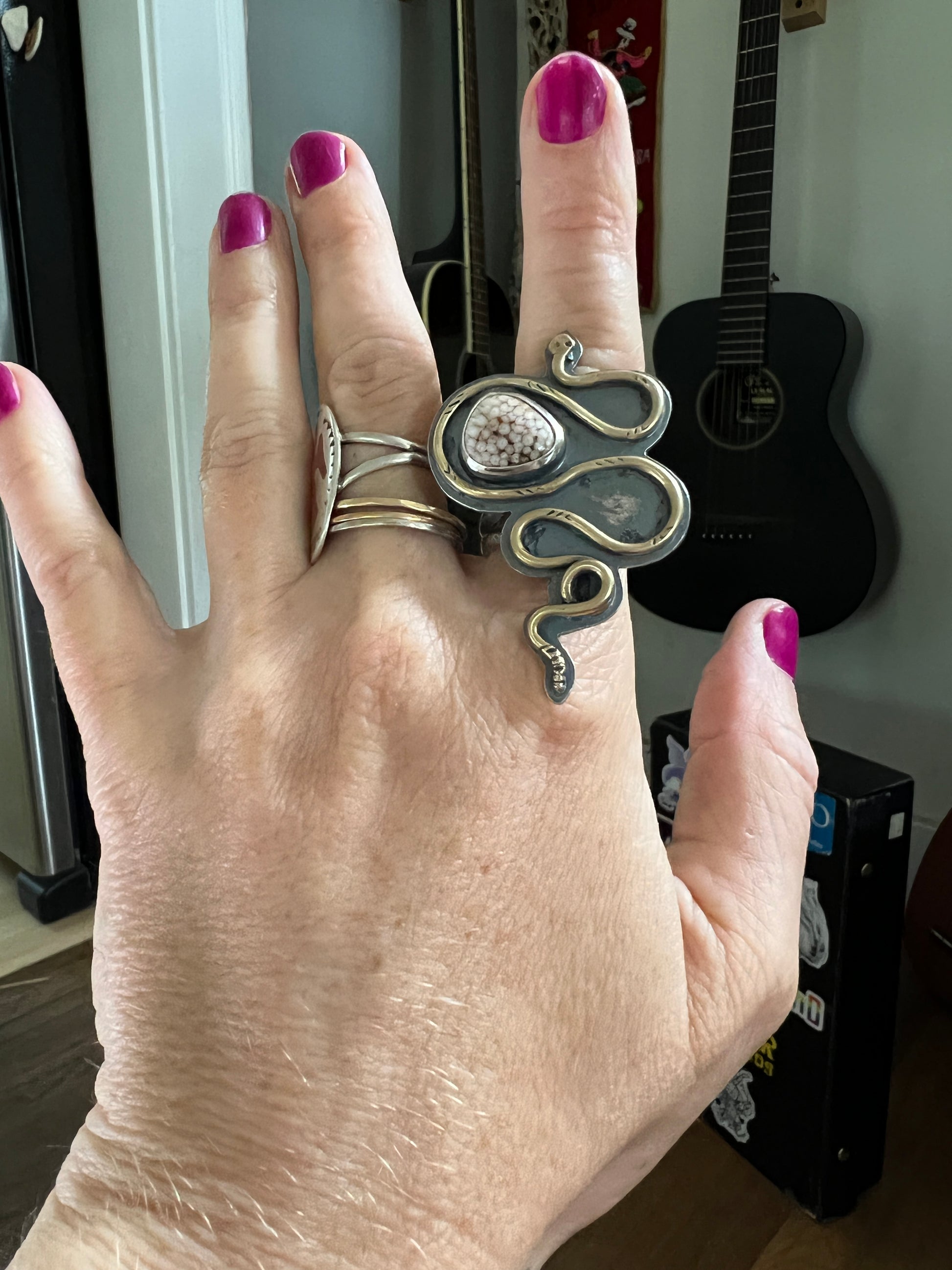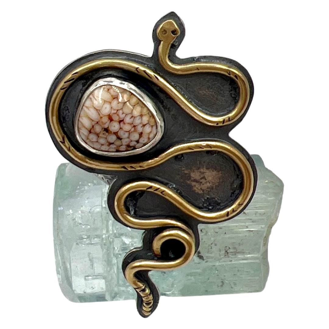One of a kind, handcrafted, sterling silver ring with brass snake atop & a beautiful piece of snakeskin agate.