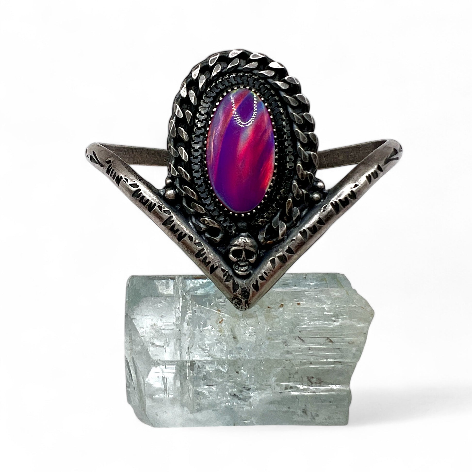 One of a kind, handcrafted, sterling silver gaviota cuff with lost wax casted sterling skull & thick Italian chain with pretty pink aura Opal stone.
