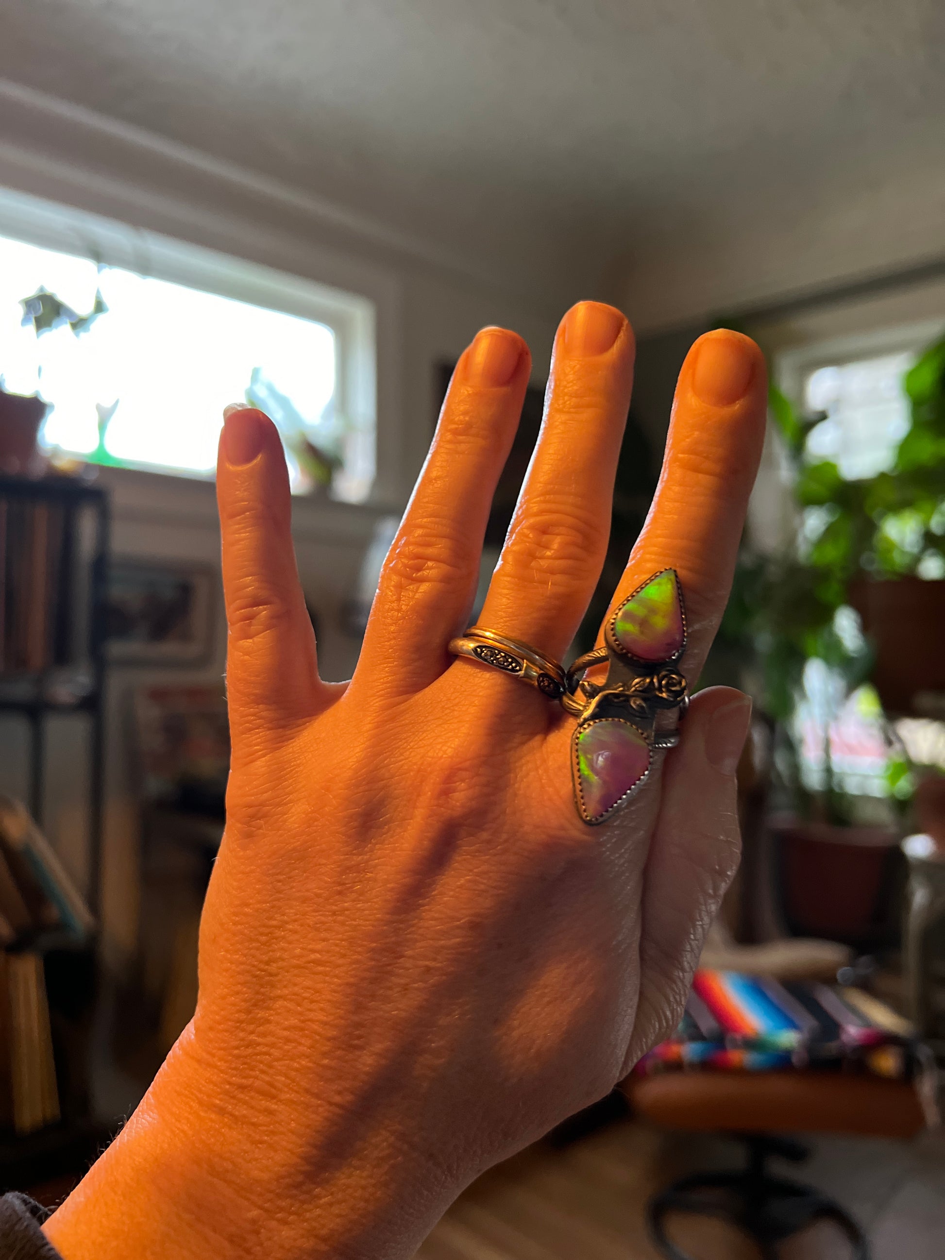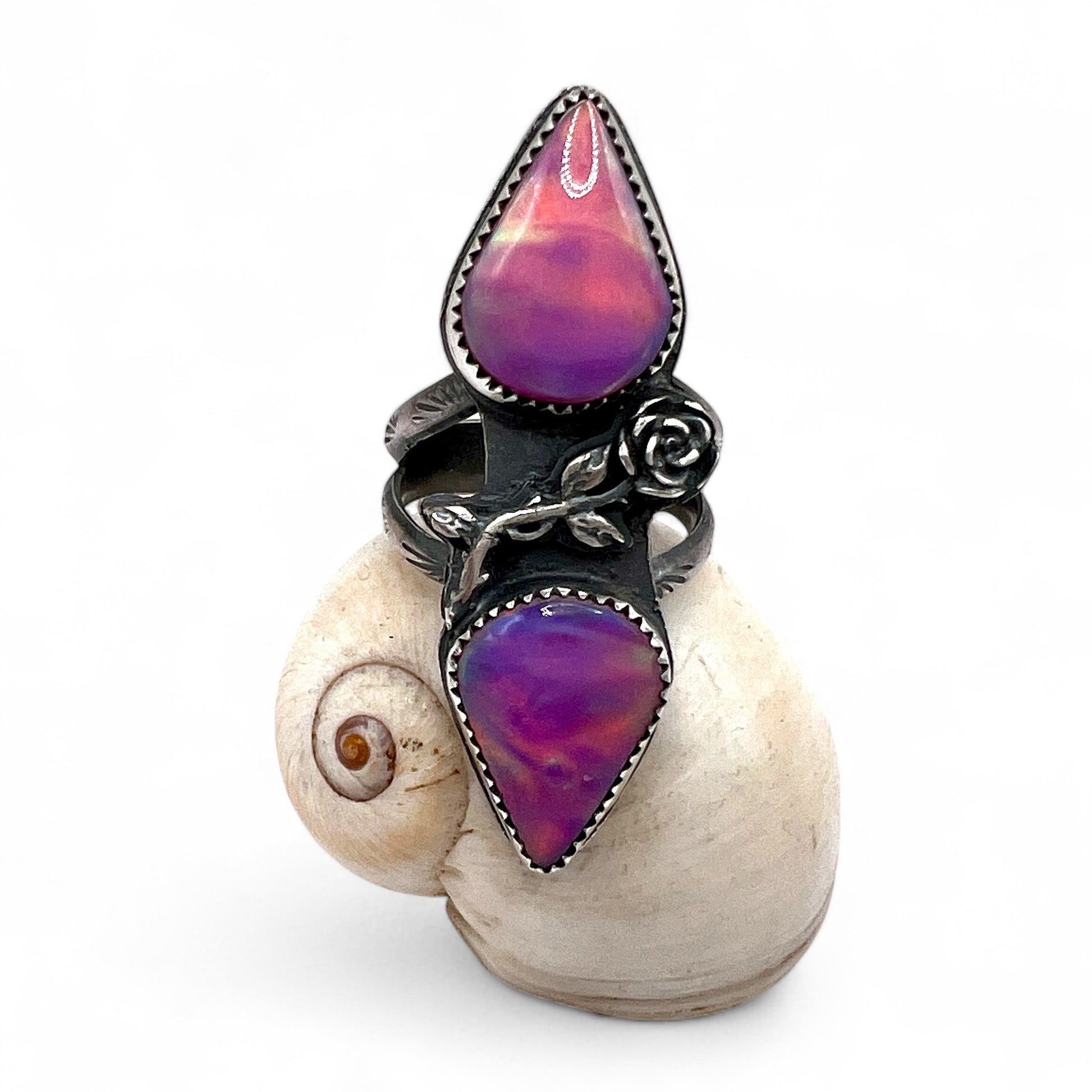 One of a kind, handcrafted, sterling silver ring with 2 gorgeous aura Opal stones & a lost wax cast rose soldered between the bezels on a split ring shank.