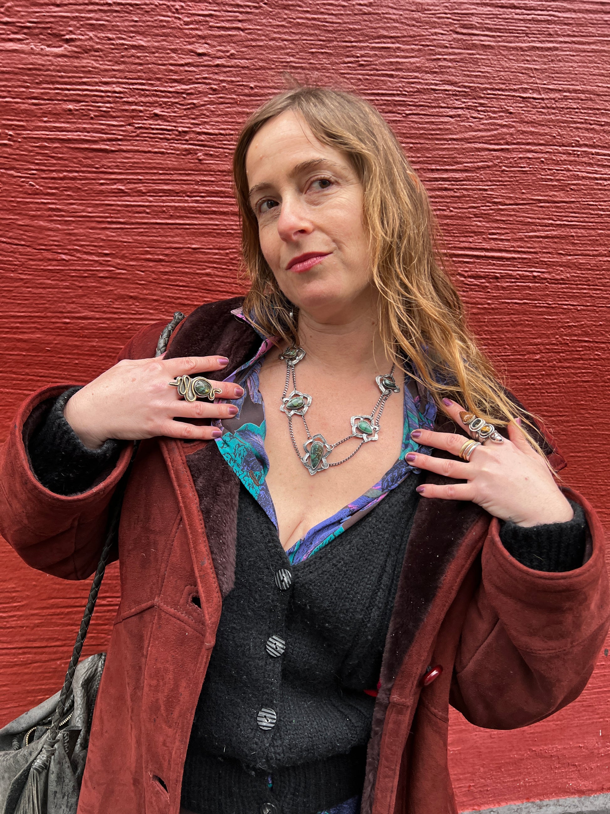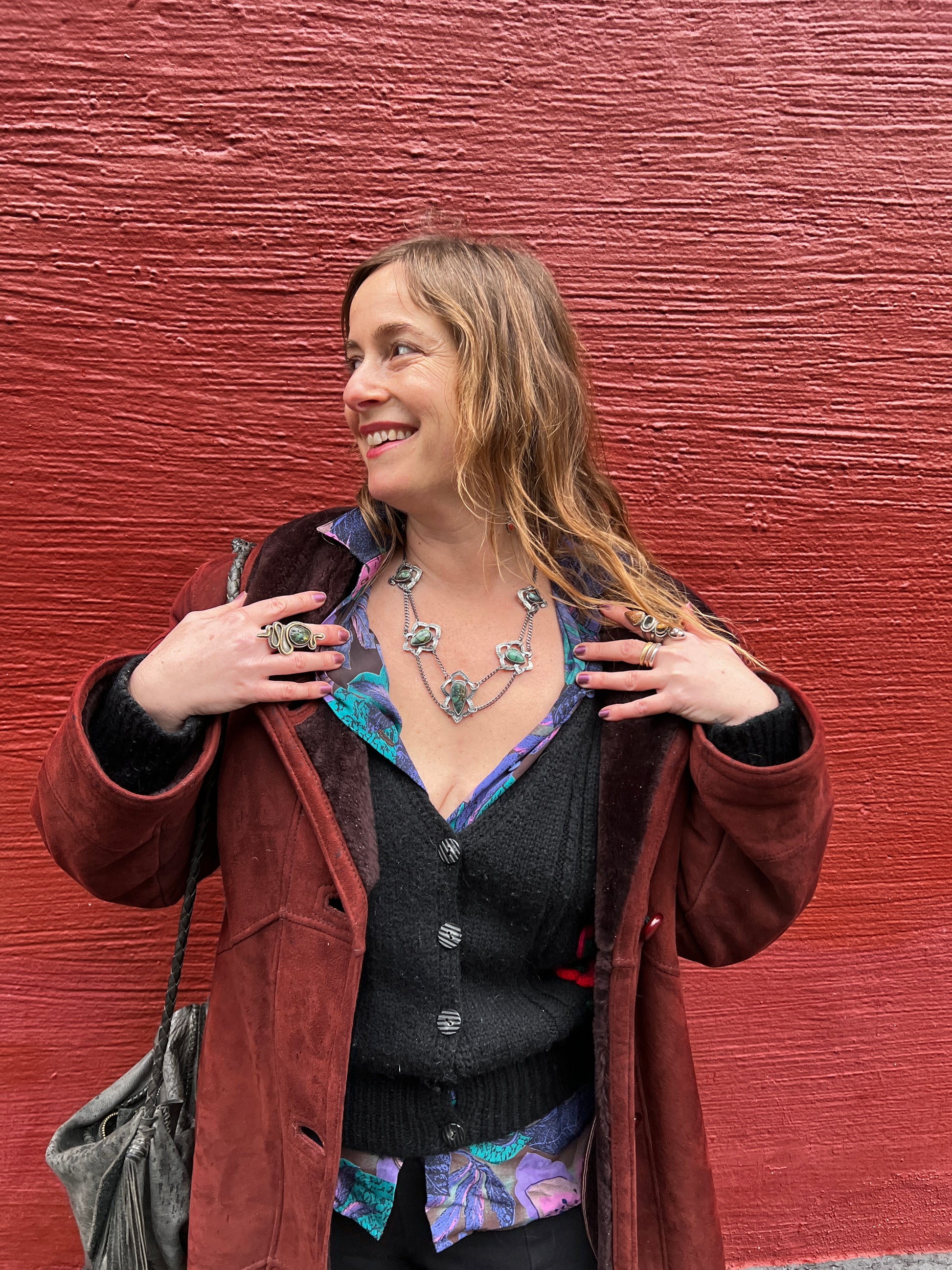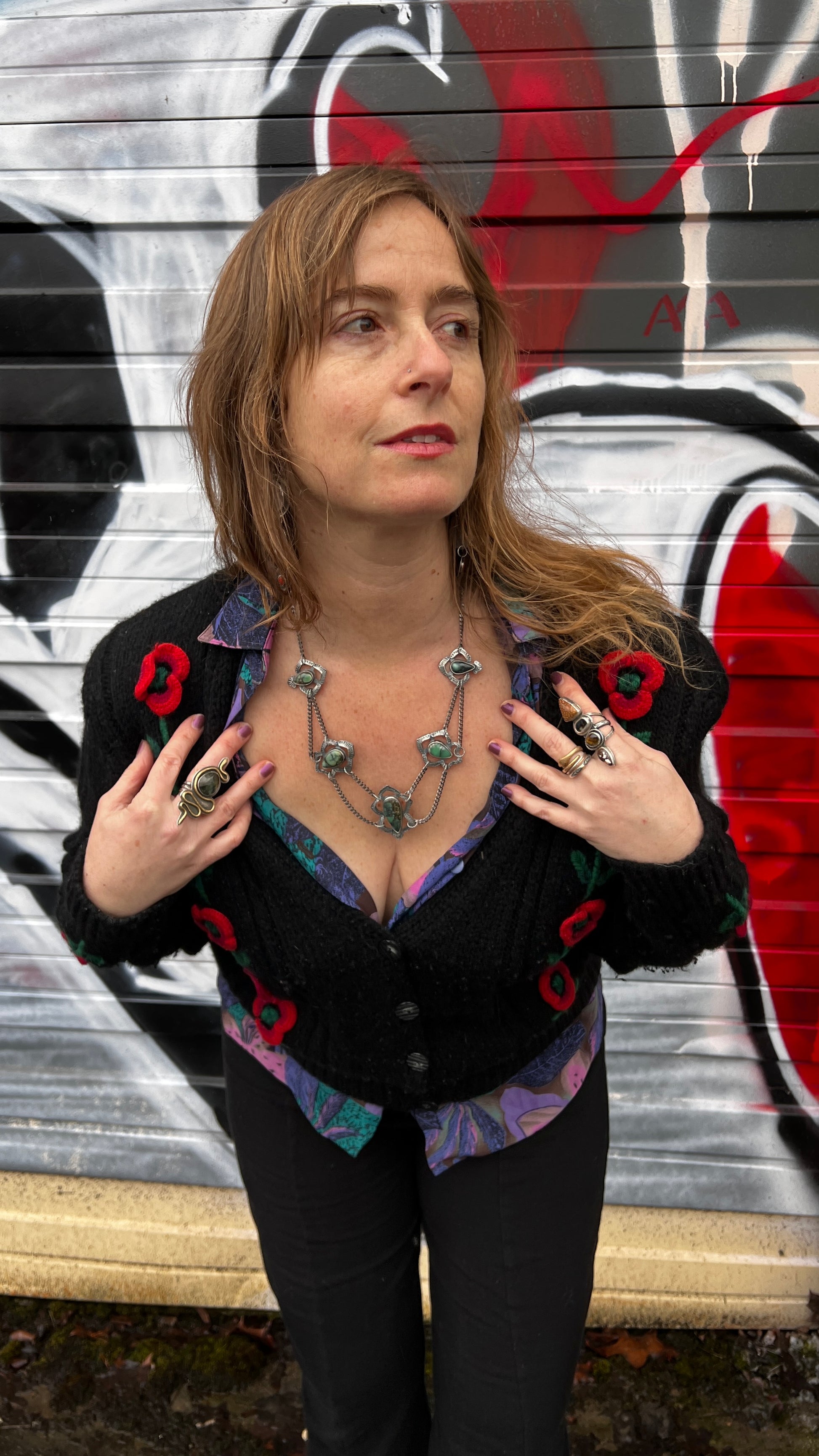 I hammered, stamped, sawed out, domed & soldered this necklace, designing it to be a show stopper. I want this to take up the whole chest in a glamorous, tasteful way. It can be worn above a shirt upon open skin. It’s 22-26” long, depending on personal preference.
