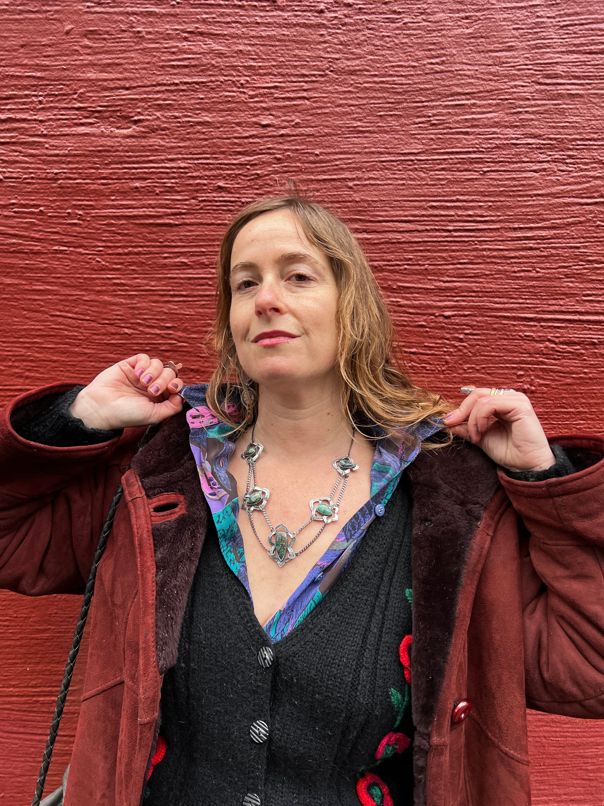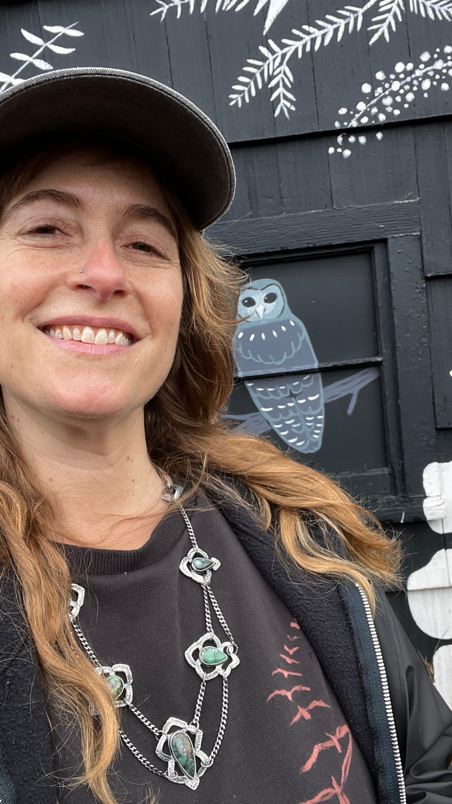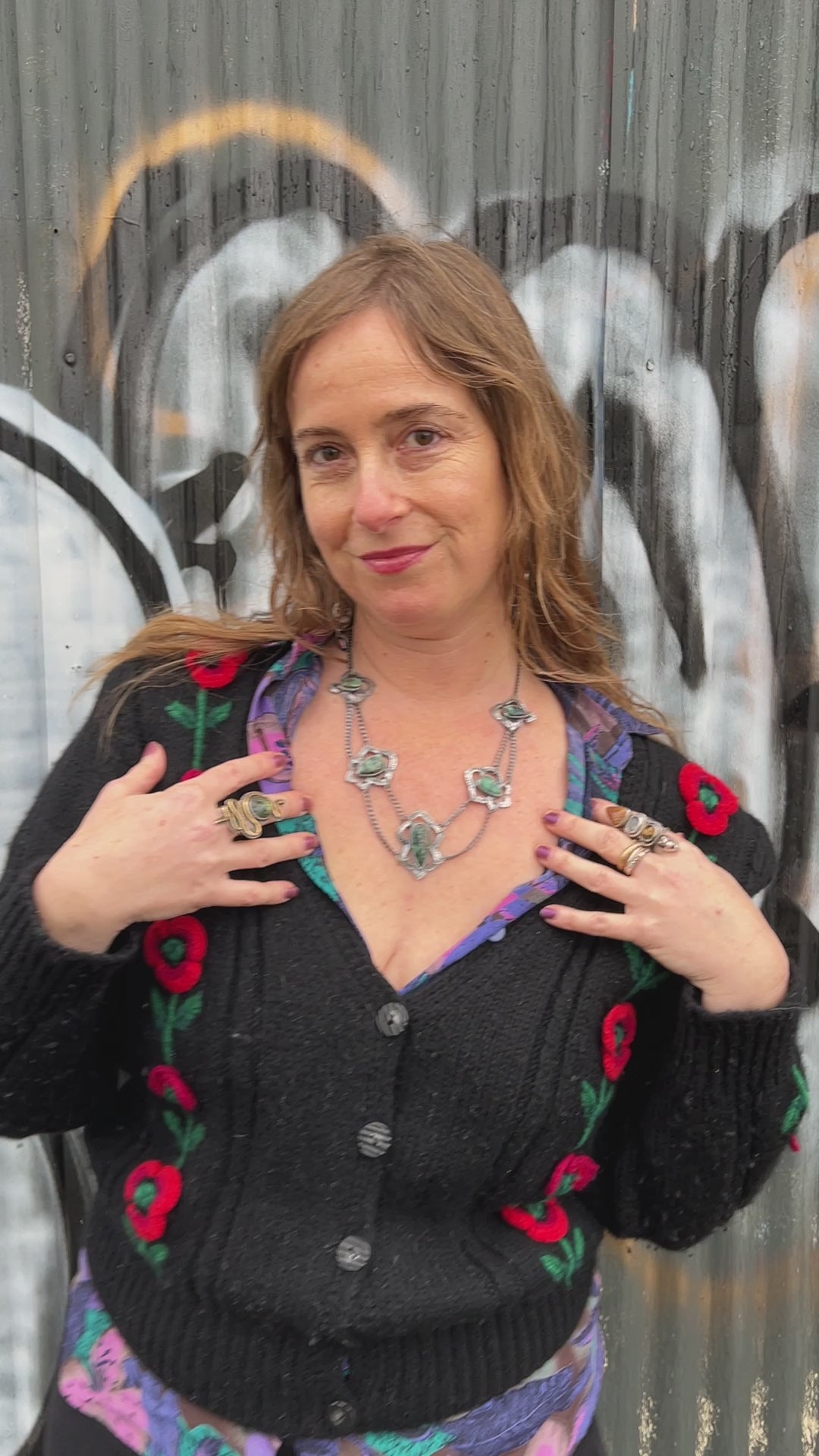 I hammered, stamped, sawed out, domed & soldered this necklace, designing it to be a show stopper. I want this to take up the whole chest in a glamorous, tasteful way. It can be worn above a shirt upon open skin. It’s 22-26” long, depending on personal preference.