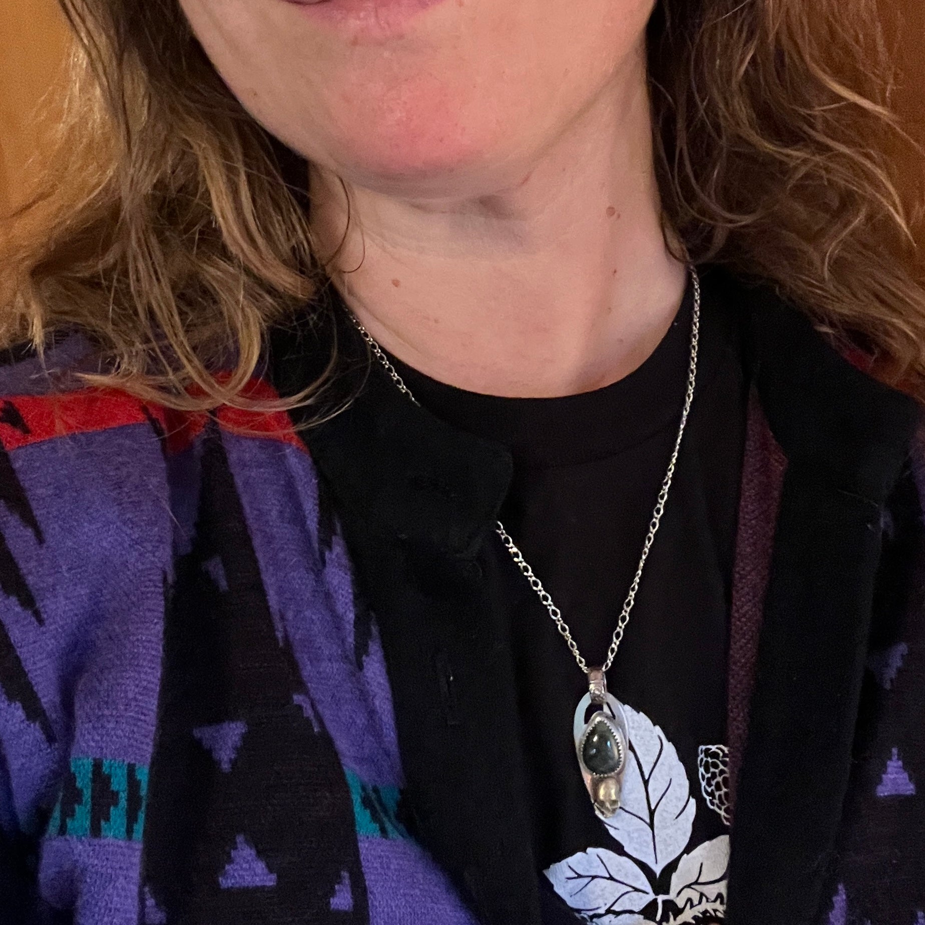 It’s hanging from 20” sterling chain with Herkimer Diamond that hangs down the back. You can adjust the length & wear it as short or as long as you like.