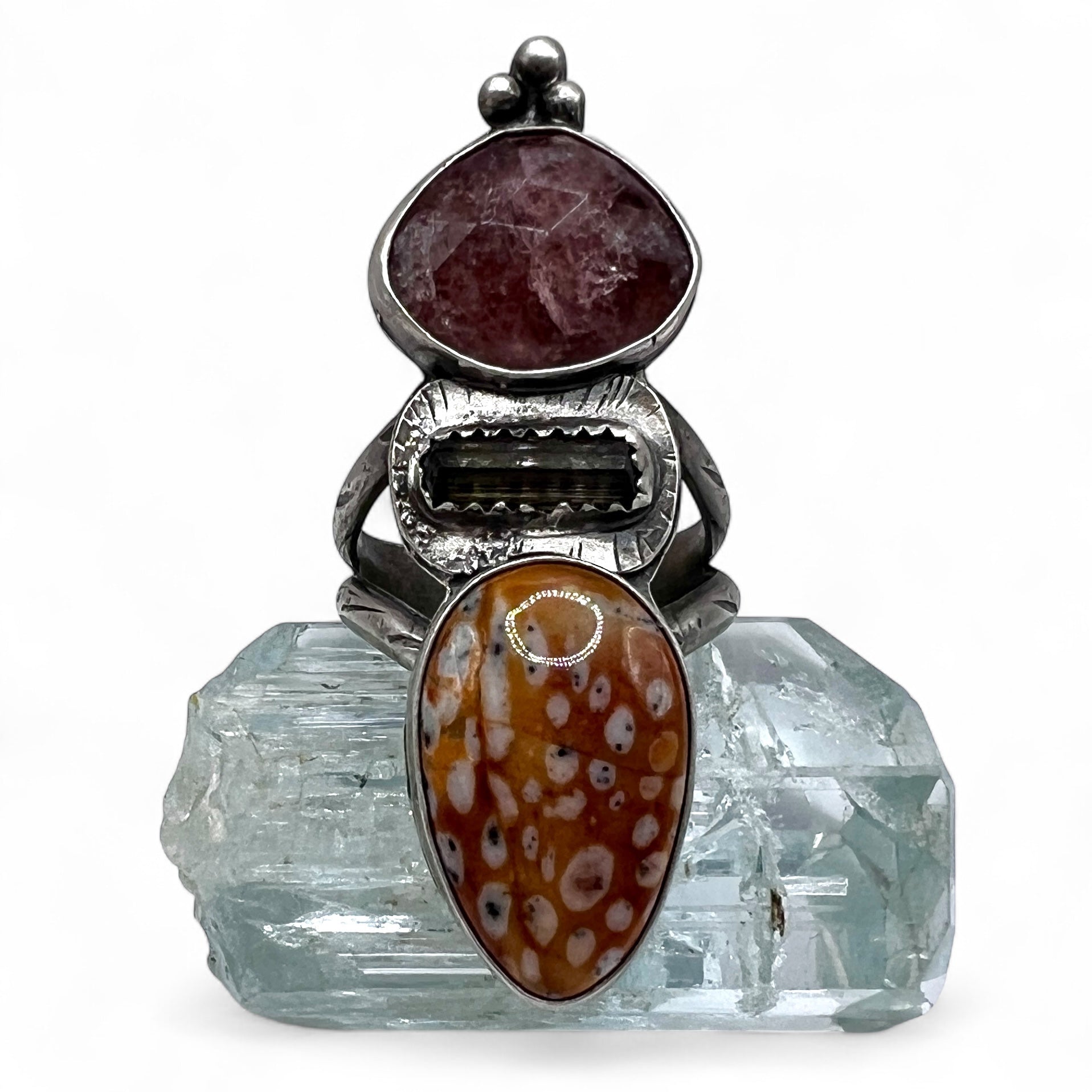 Strawberry Quartz, Tourmaline and Jasper Ring size 7.75
