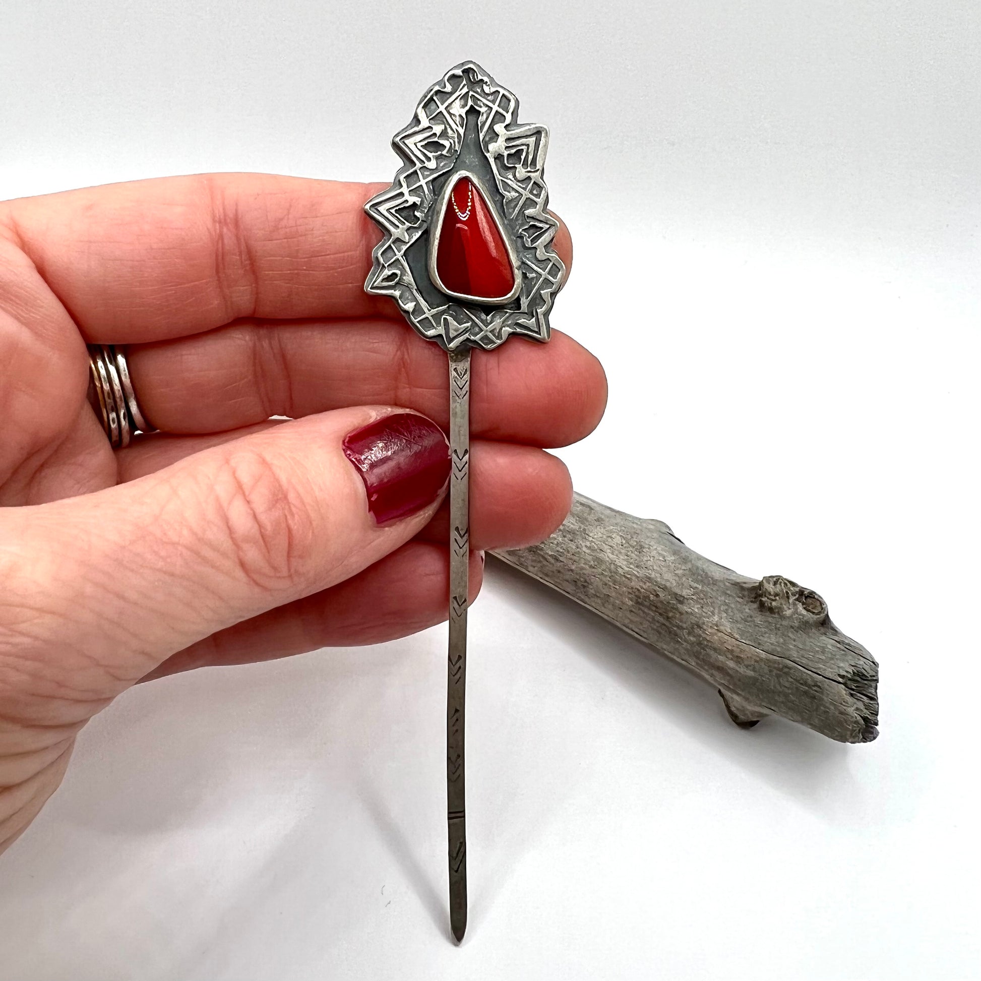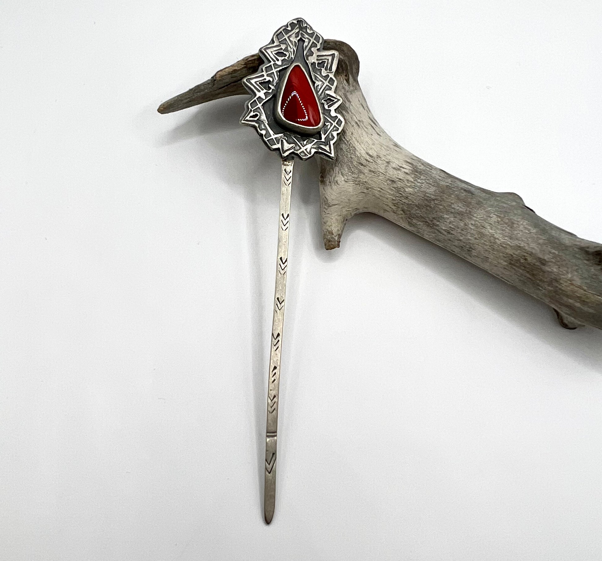4.25” long, this is a 1 of a kind, handcrafted, sterling silver pin that is created to hold your ruana, scarf, shawl, or sweater together.