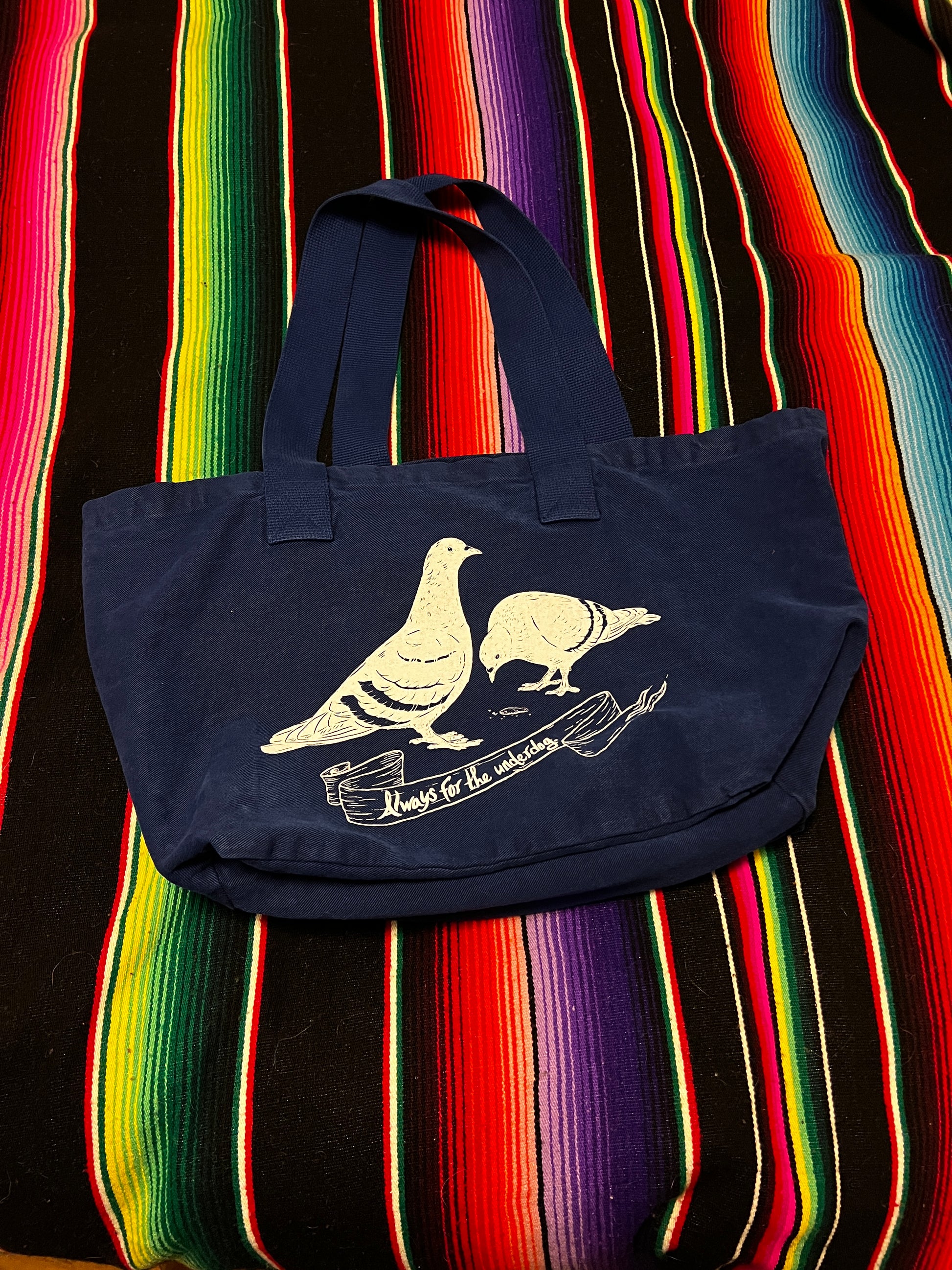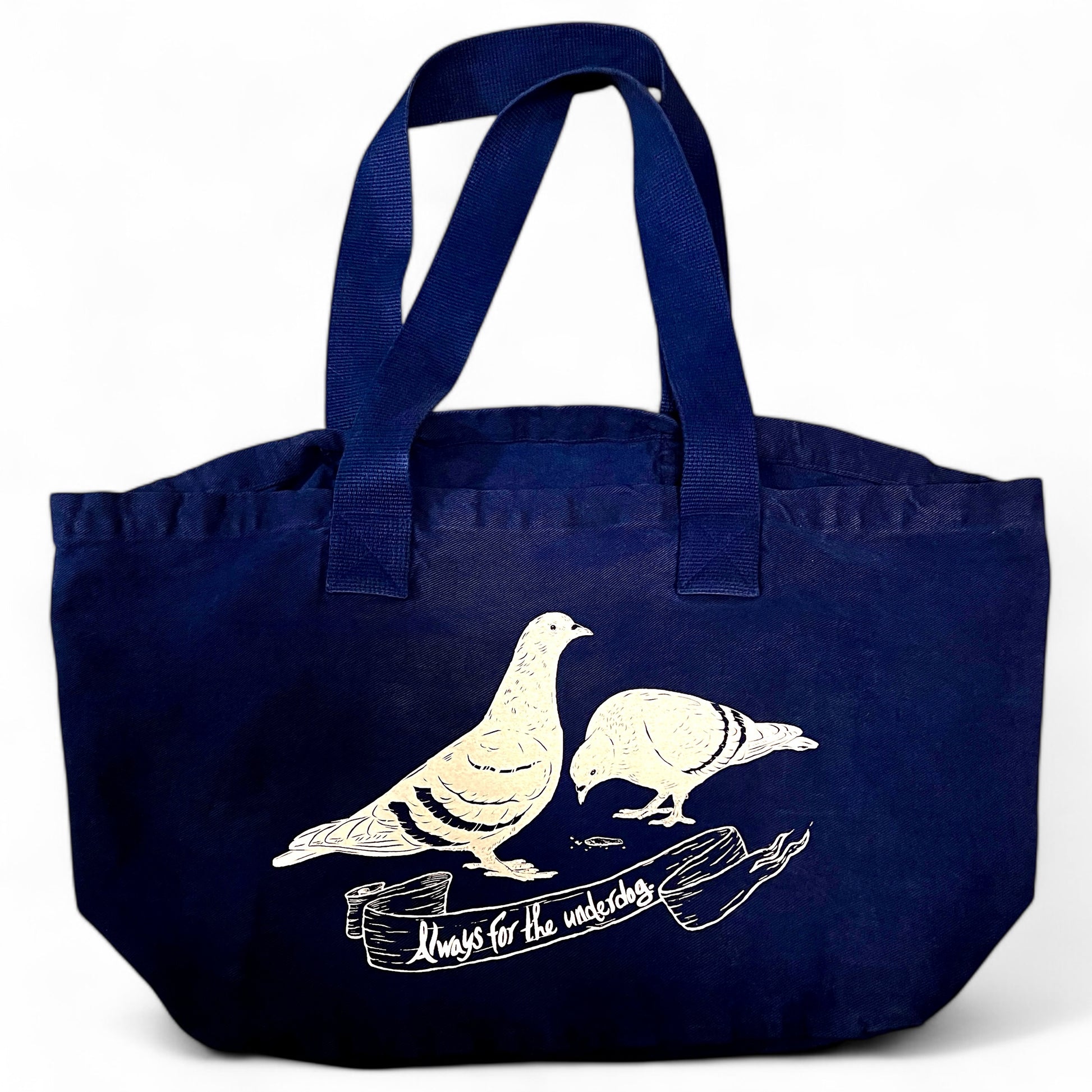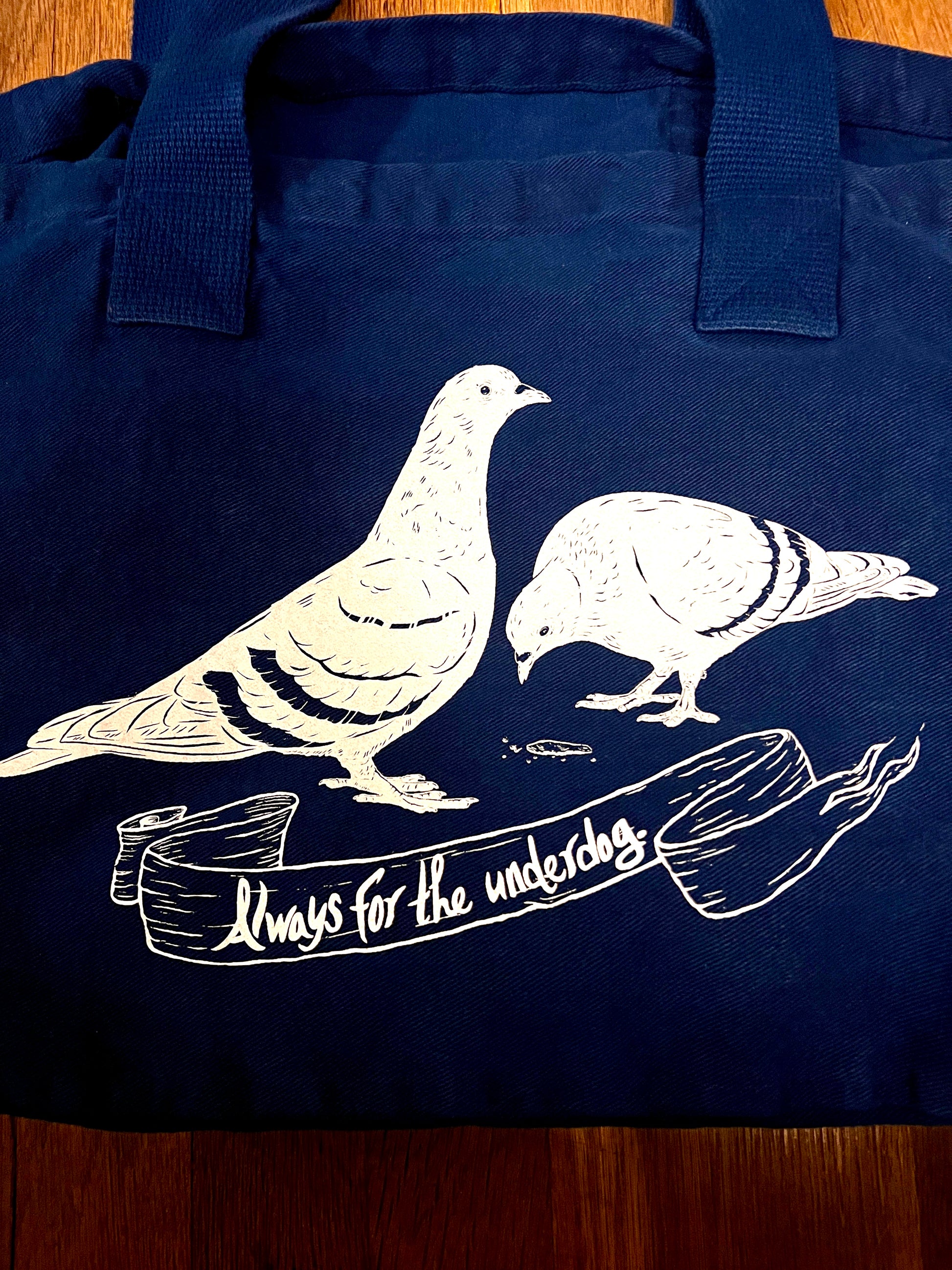 ”Always for the underdog.” is written on a ribbon below 2 rock doves (pigeons) 🕊️ casually snacking on seeds.