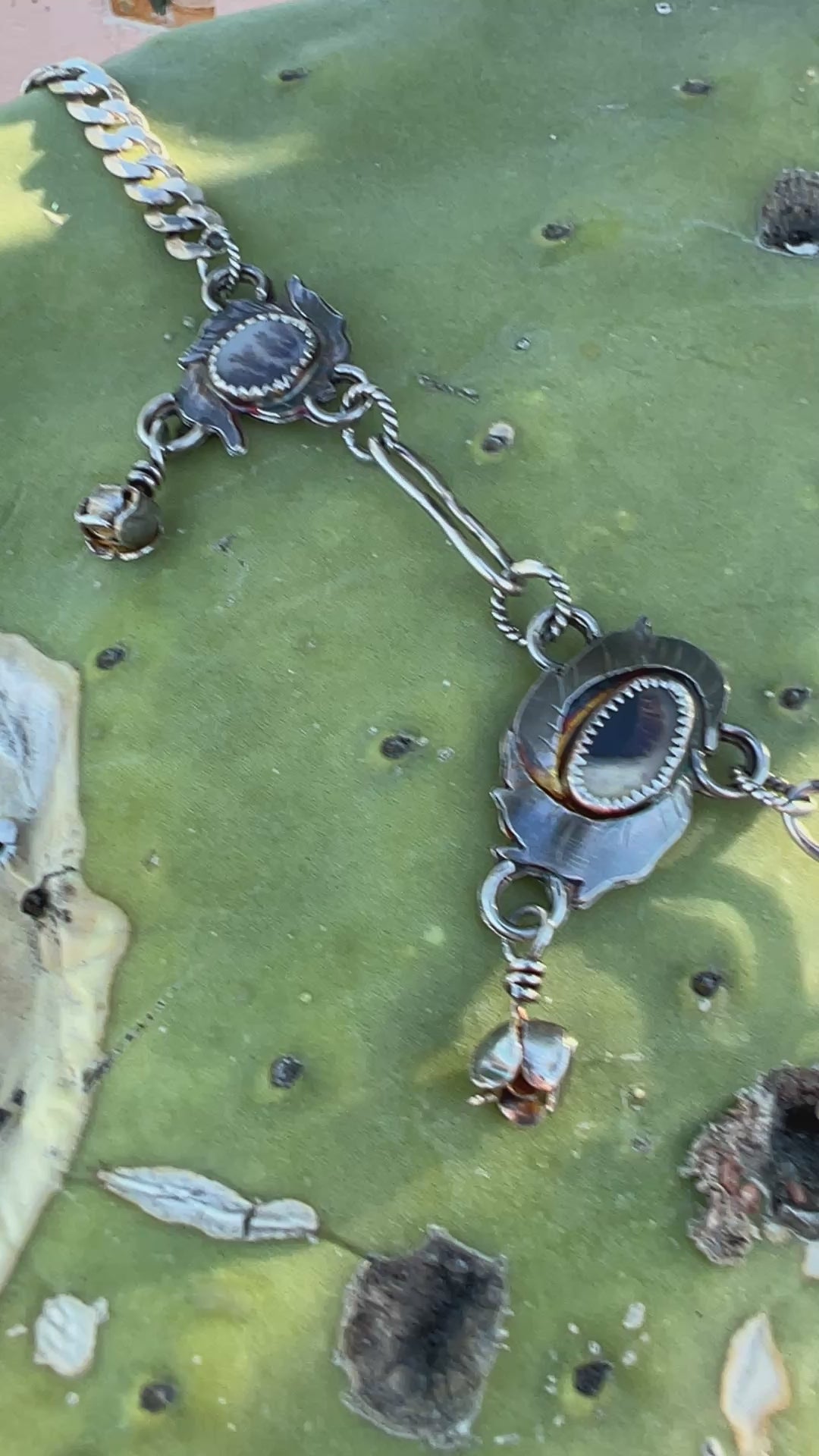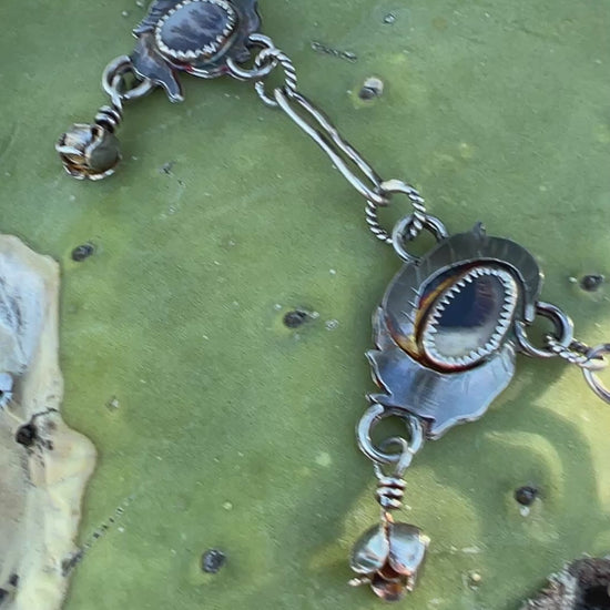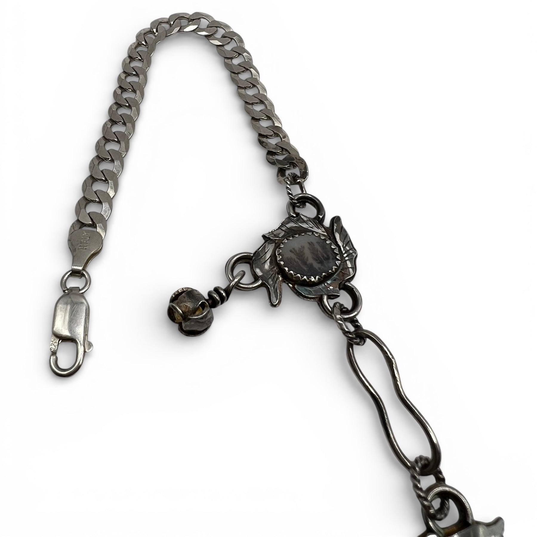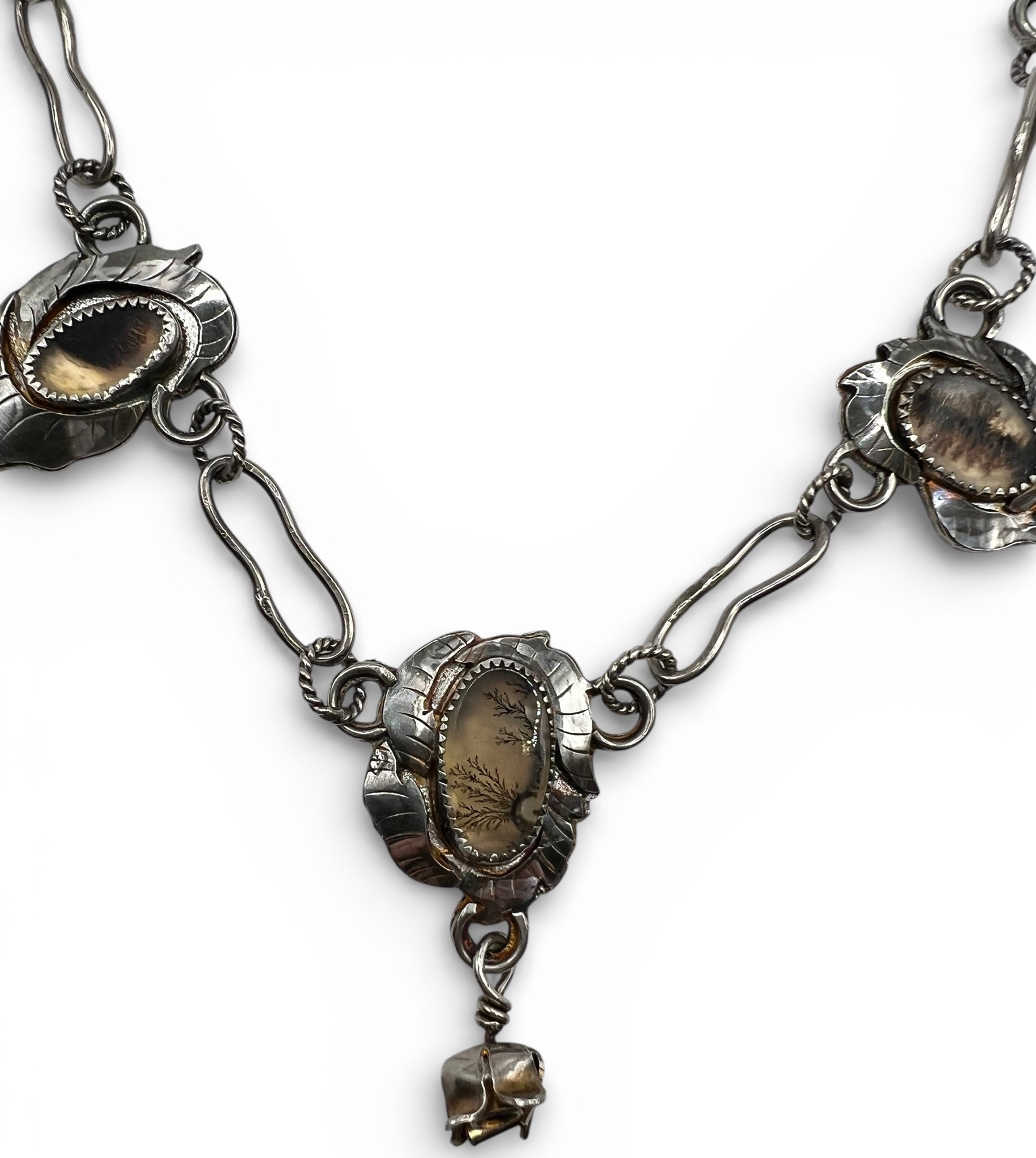 One of a kind, hand crafted, sterling silver Rose Parade style necklace with 5 pretty, individual cuts of dendritic agate (or dendrite) stone. They all look like a tree, lightening, veins, leaves, or something naturally occurring. The name "dendritic agate" comes from the Greek word "dendron," which means "tree."