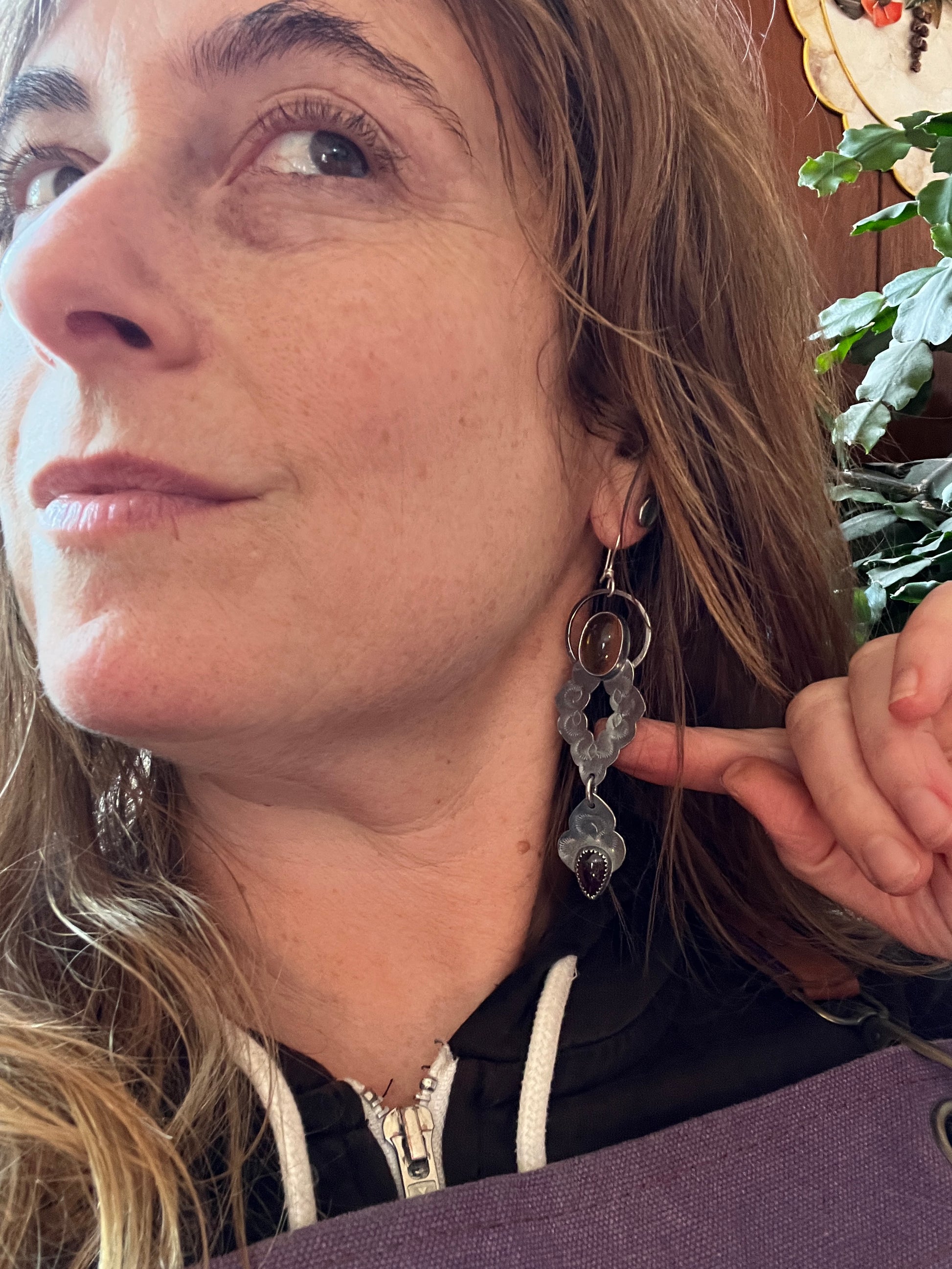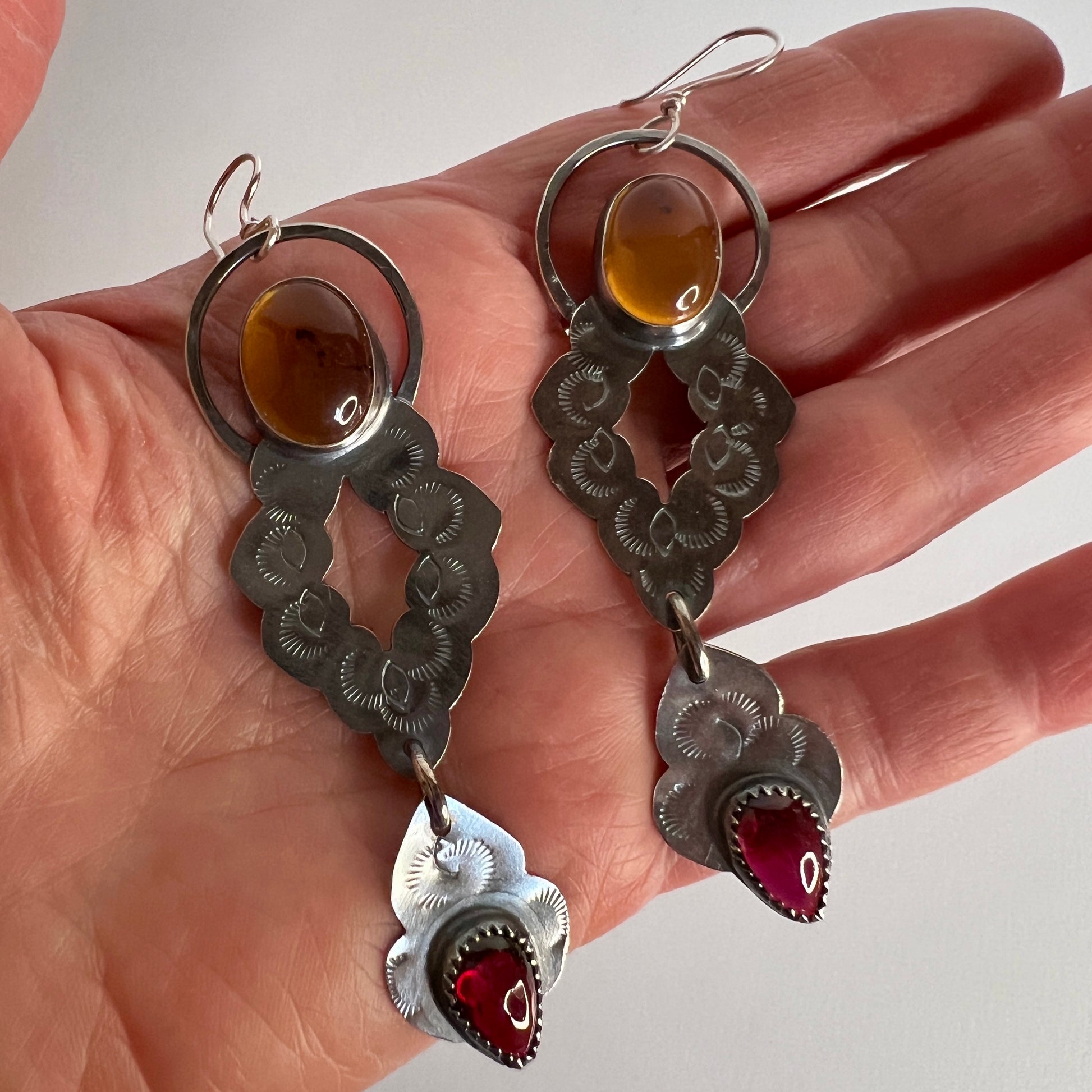 One of a kind, hand, hammered and sawed sterling silver with ethically sourced stones of smooth Baltic Amber and grape Garnet. The backs have been sawed out so you can see through the stones albeit it obscured. The silver has been antiqued with sulfur & tumbling medium.