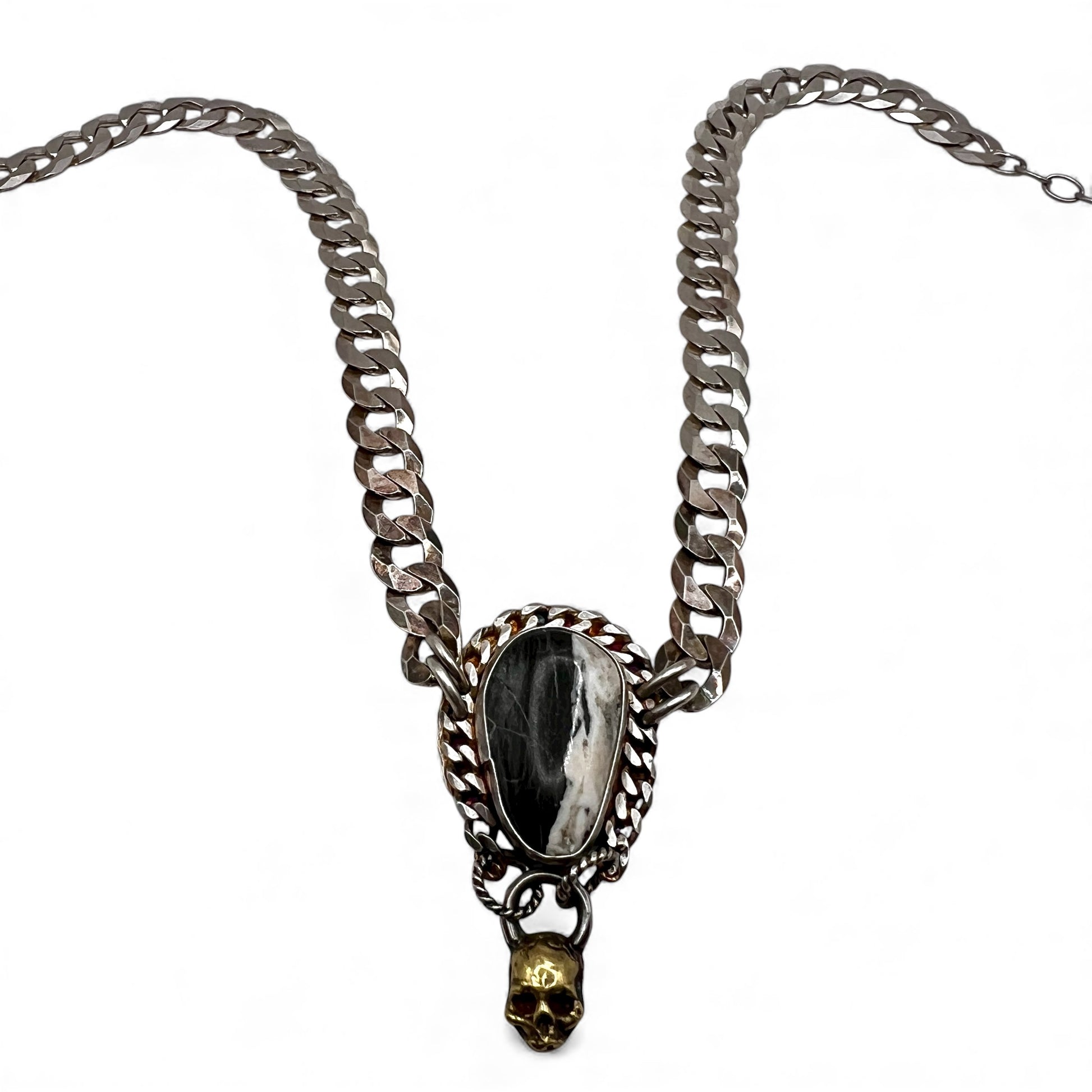 One of a kind, handcrafted, sterling silver necklace with thick, Italian, 8 mm beveled flat curb chain that lies flat, and a beautiful piece of white buffalo turquoise. The skull that hangs is Wax cast brass.